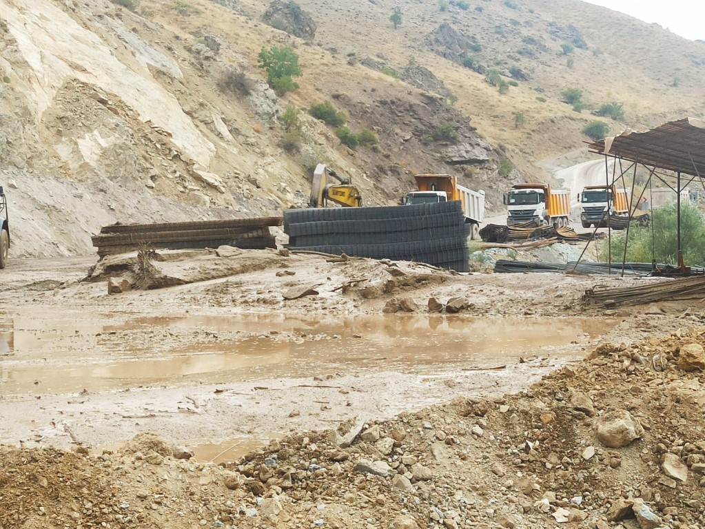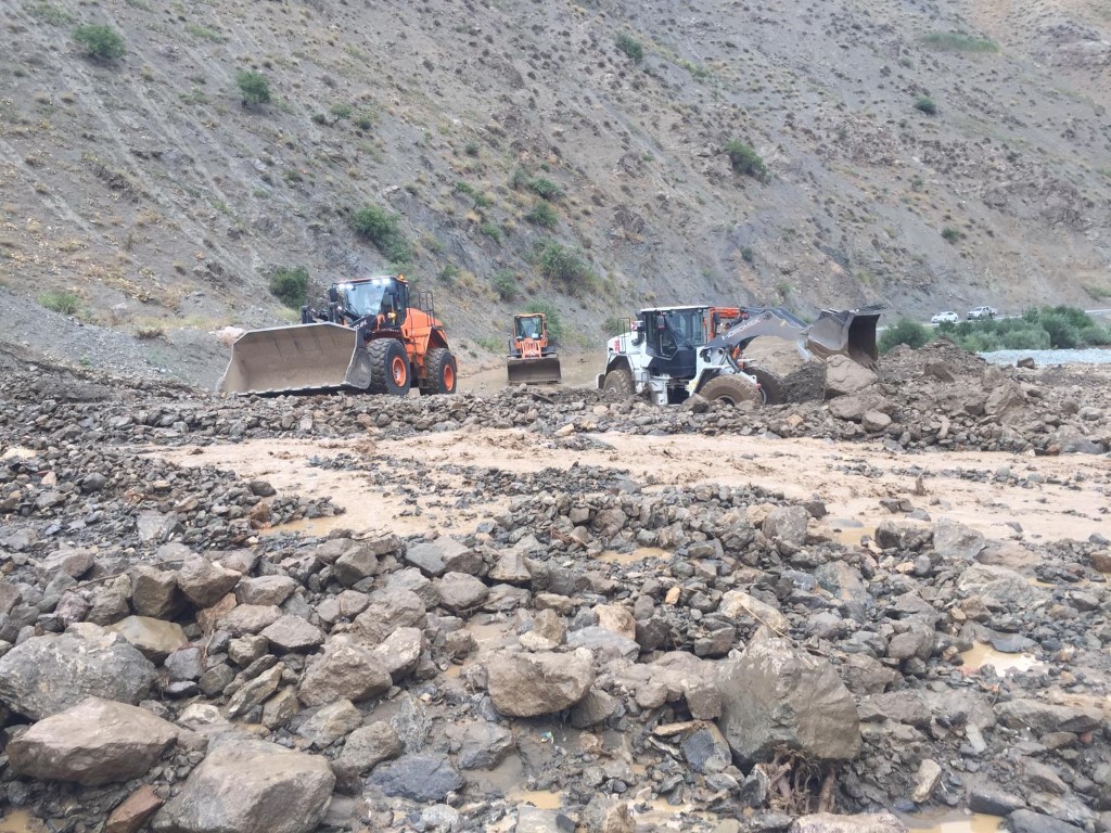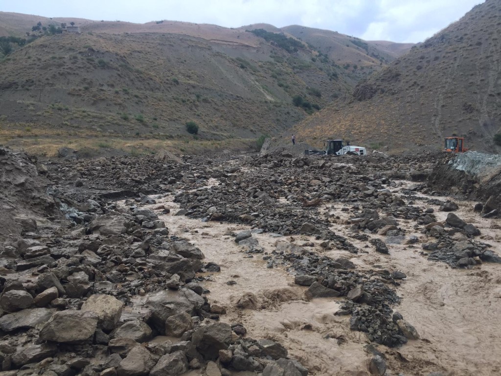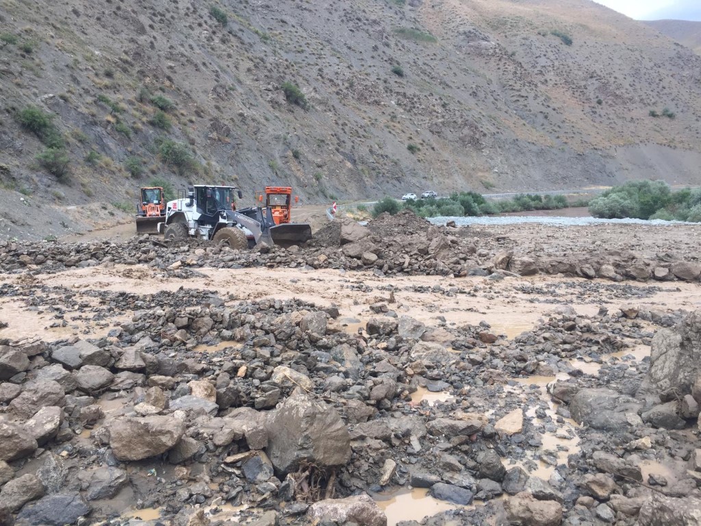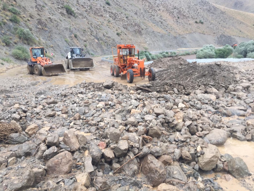 Yüksekova ilçesine bağlı Akalın Mahallesi yakınındaki derenin taşması sonucu kapanan yolun açılması için de ekipler çalışma yürütüyor.