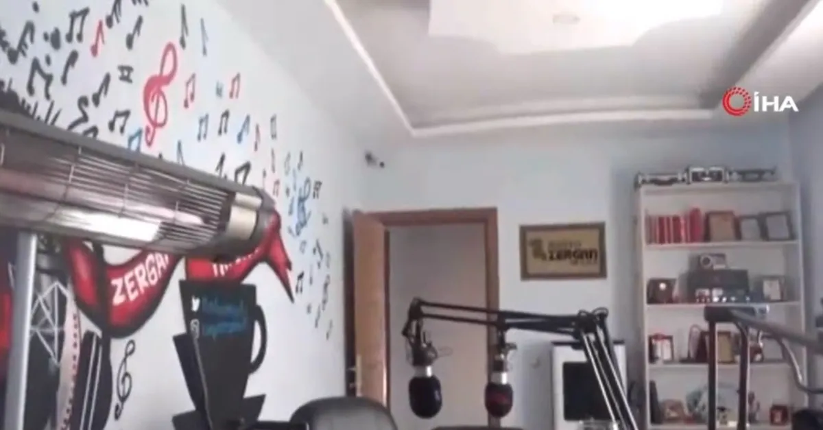 Bir radyo stüdyosunda depremin şiddeti kameraya yansıdı.