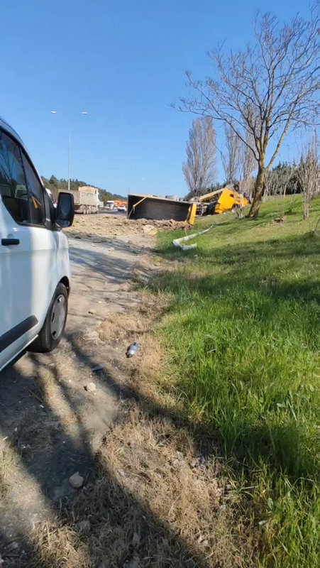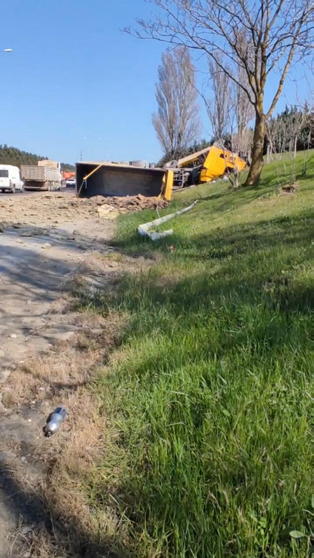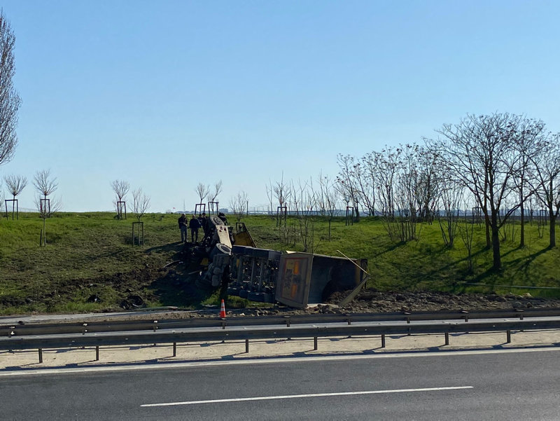 Otoyolun Edirne istikametinde ilerleyen hafriyat kamyonu, sürücüsünün kontrolünü kaybetmesi üzerine karşı şeride geçip iki otomobile çarptı. Çarpmanın etkisiyle devrilen kamyon sürüklenerek yol kenarında durabildi.