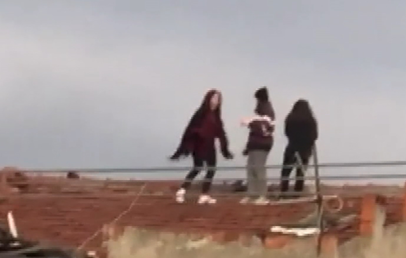 Binanın ve çatısının eski olduğuna aldırmadan rahatça çatıda gezen genç kızlar, bir süre sonra bulundukları yerden inerek gözden kayboldu.