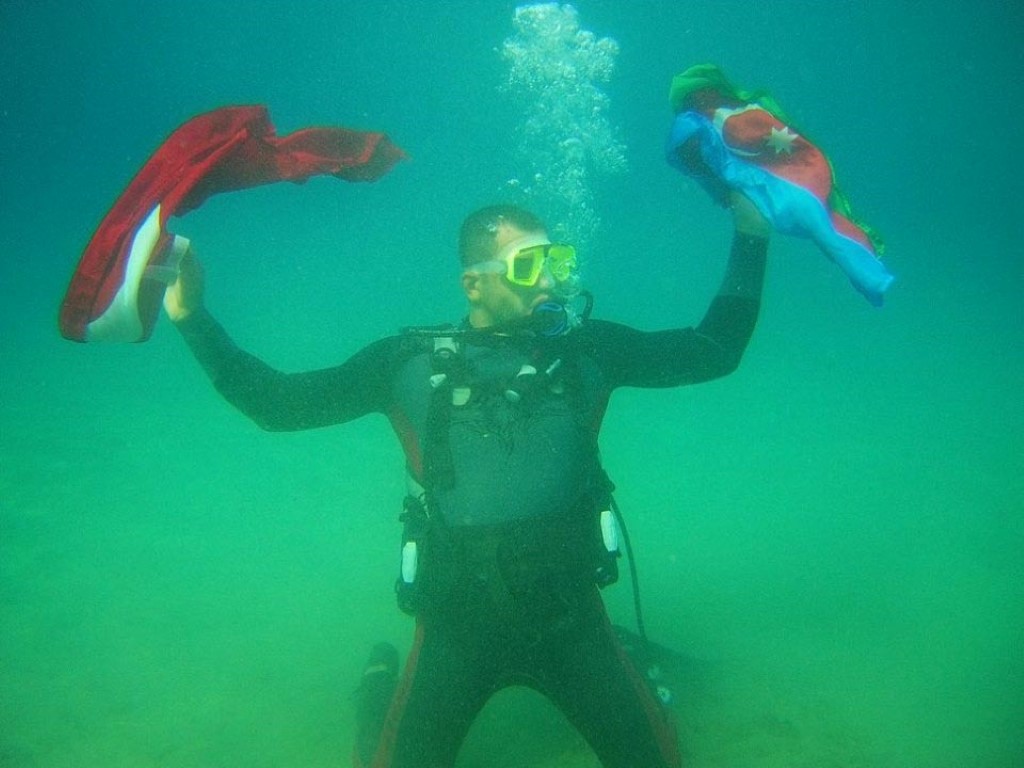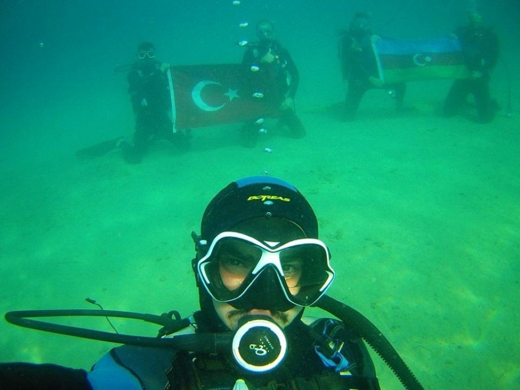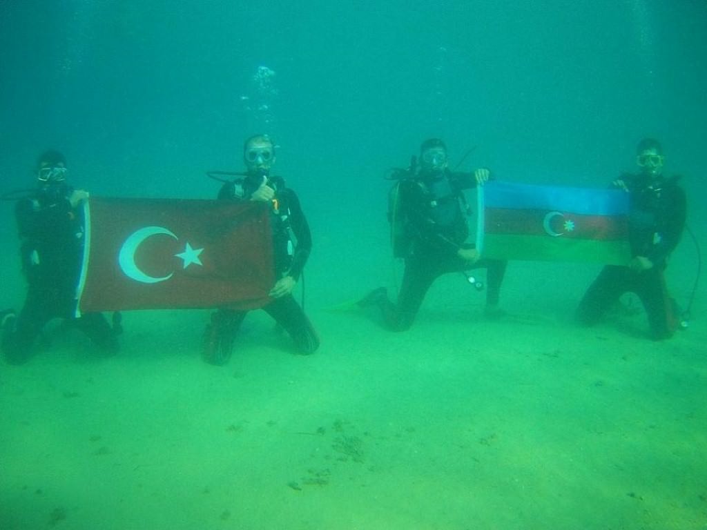 İzmir'in Foça İlçesi'nde faaliyetlerini sürdüren Foça Dalış Merkezi'nin (FDM) Azeri kursiyerleri sualtında Türk ve Azerbaycan bayrağı açtı. Azeri konuklar 18 metre derinlikte iki devlet bir millet vurgusu yaptı.