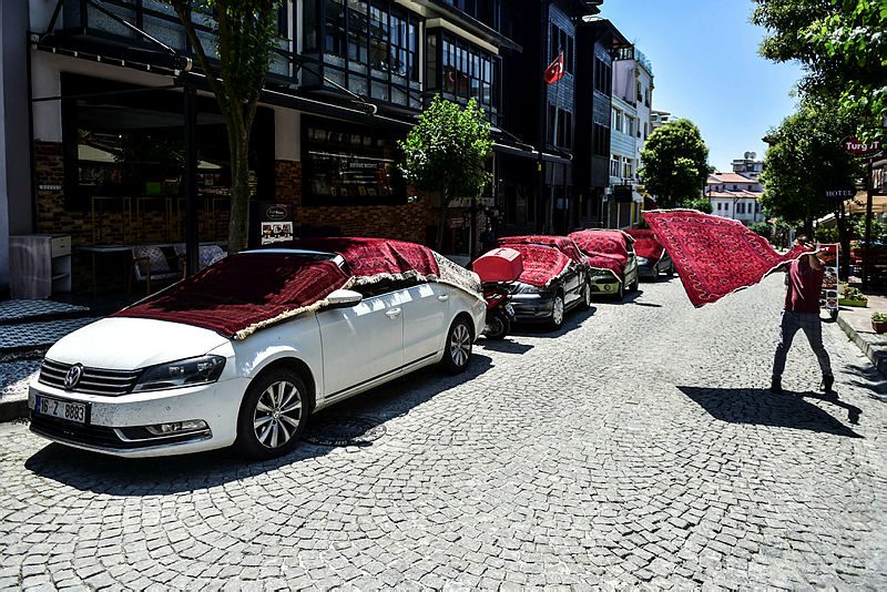 Havadan çekilen görüntülerde ise araçların üzerine ve bir binanın çatısına örtülen kırmışı halılar ilginç manzaralar oluşturduğu görülüyor. Onlarca arabanın üzerine halı serilmesi ise Antalya'nın Döşemealtı ilçesinde tarlalara serilen el dokuması halı ve kilimlerin oluşturduğu halı tarlalarını anımsattı.