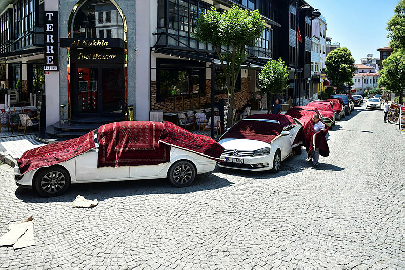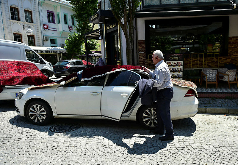 Yaklaşık 3 ay boyunca kapalı kalan depodaki halıların nemlendiğini fark eden iş yeri sahibi, sorunu ilginç bir yöntem ile çözmeye karar verdi. Nemlenen halıları çevrede park eden tanıdığı esnaf arkadaşlarının arabalarının üzerine serdi.