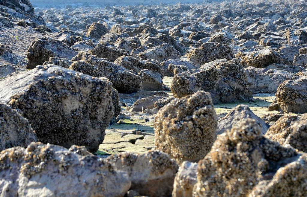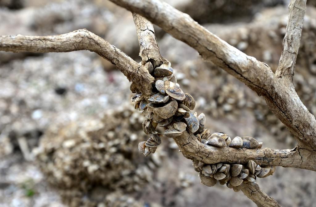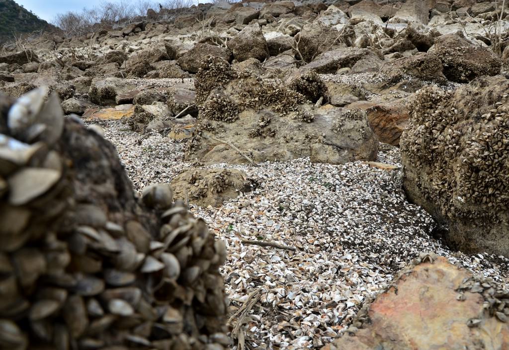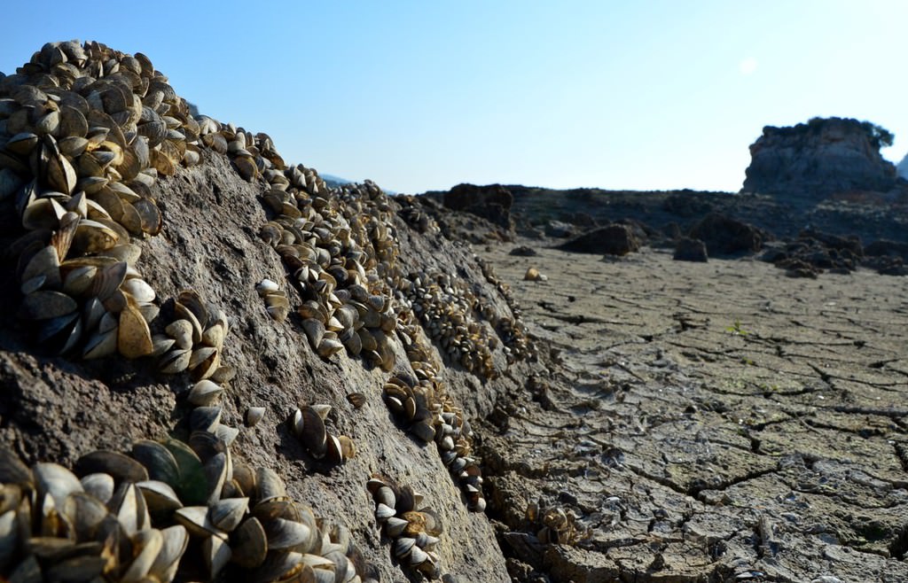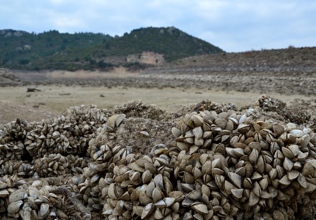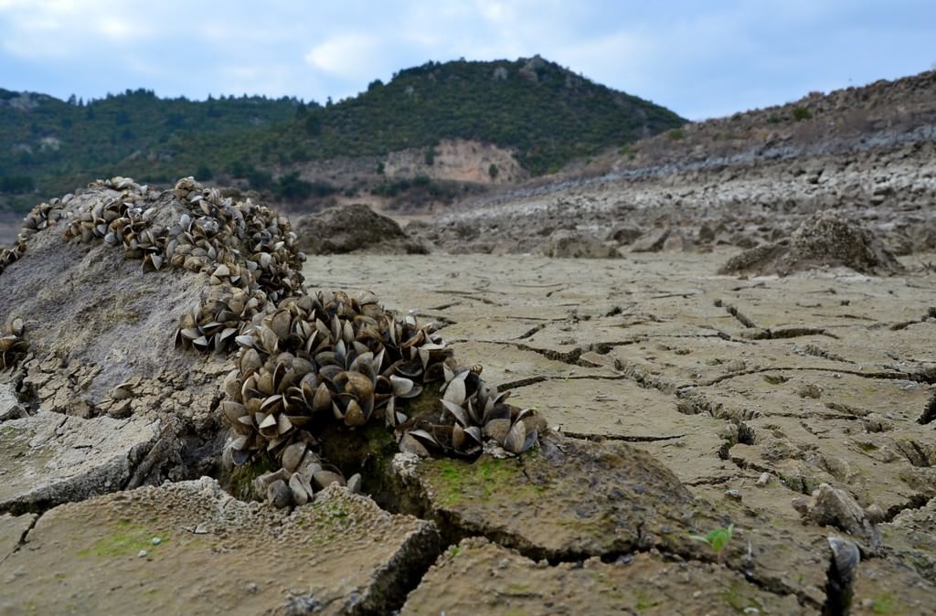 Suların çekilmesinin ardından, baraj yatağındaki taşlara tutunan milyonlarca tatlı su midyesi gün ışığına çıktı. Midye tarlasını andıran baraj yatağı ve toprak zemindeki çatlaklar kuraklığın izlerini taşıyor.