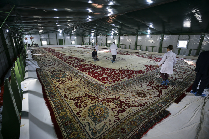 Yıldız Şale Köşkü'nün Tören Salonu'nda bulunan 120 yaşında ve 468 metrekare büyüklüğündeki dünyanın en büyük halılarından biri olan Hereke halısı restorasyon öncesinde ilk defa yıkandı.