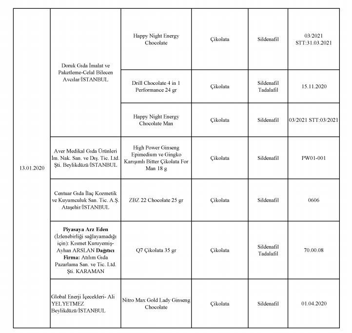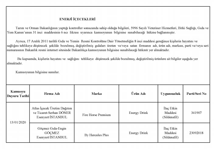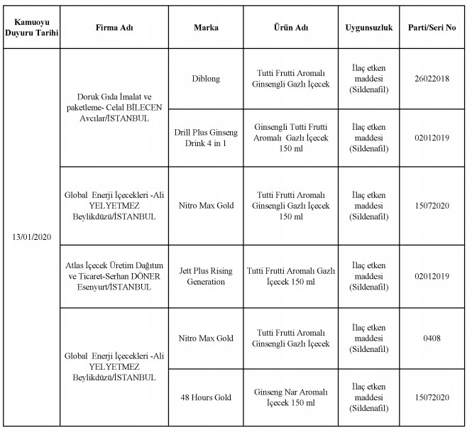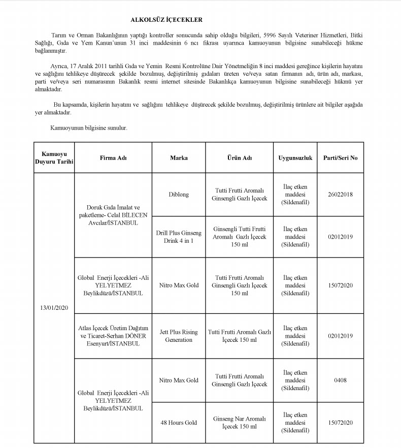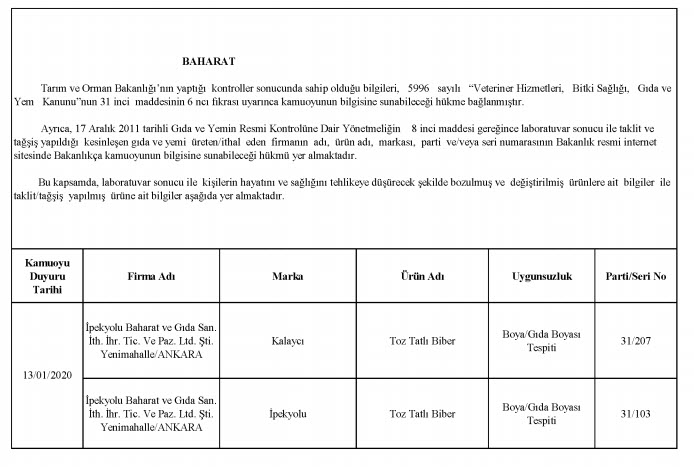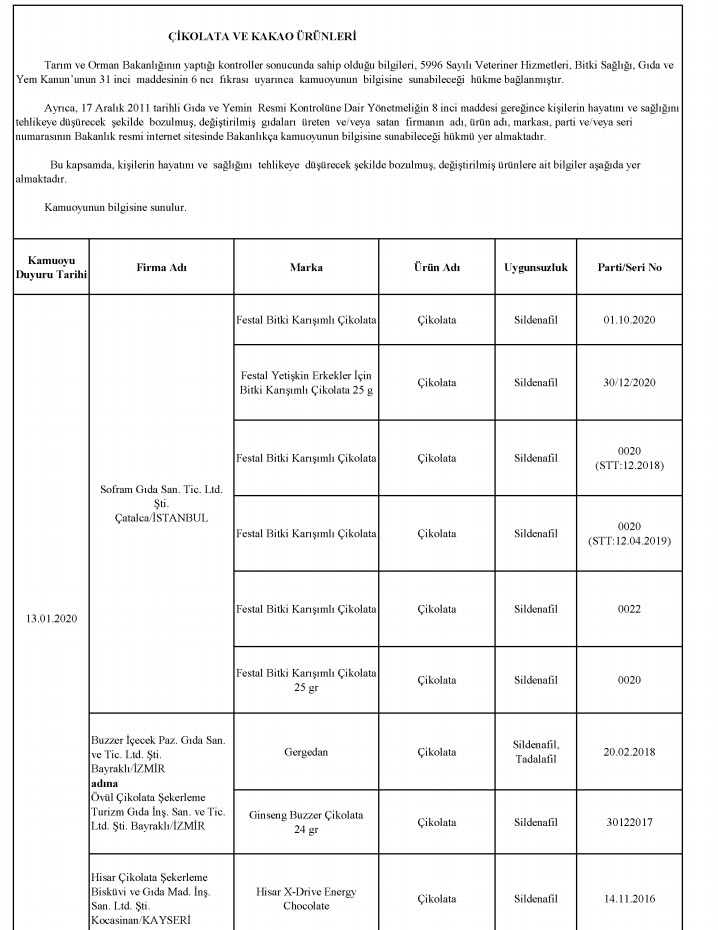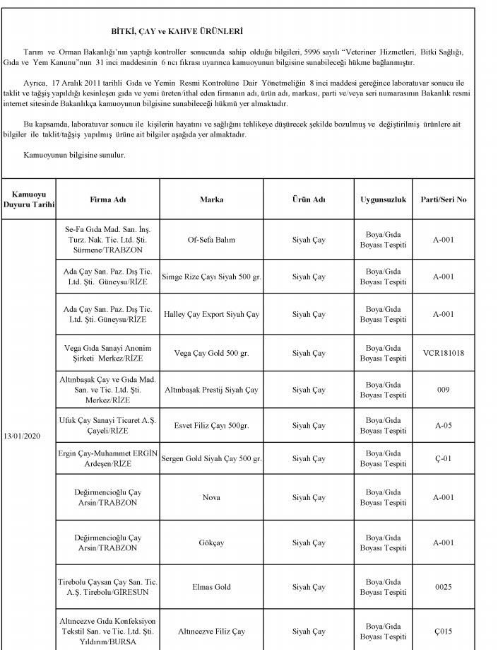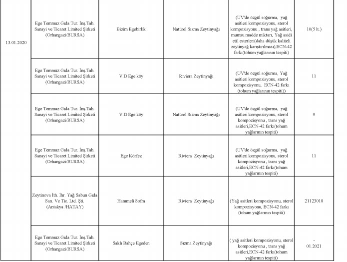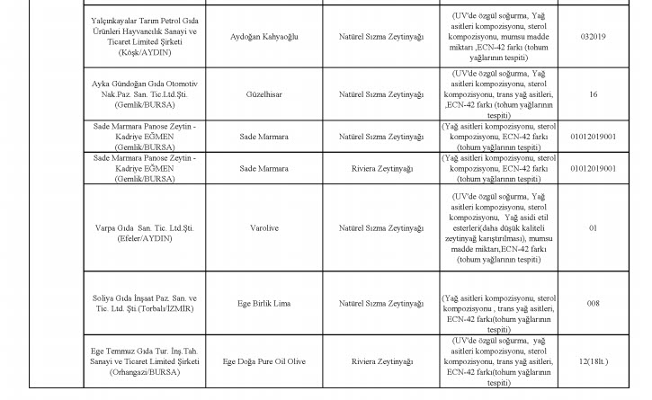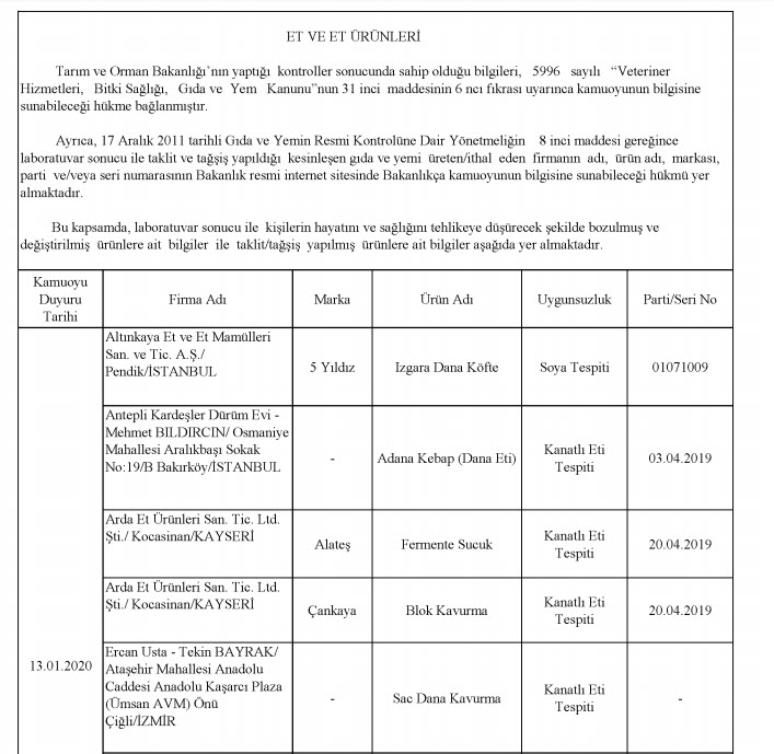 Bakanlığın yayınladığı listesinde laboratuvar sonucuyla taklit veya tağşiş yapıldığı kesinleşen gıdaları üreten/ithal eden; kişilerin hayatını ve sağlığını tehlikeye düşürecek şekilde bozulmuş, değiştirilmiş gıdaları üreten ve/veya satan firmanın adı, ürün adı, markası, parti ve/veya seri numarasını içeren bilgiler kamuoyunun bilgisine sunuldu.