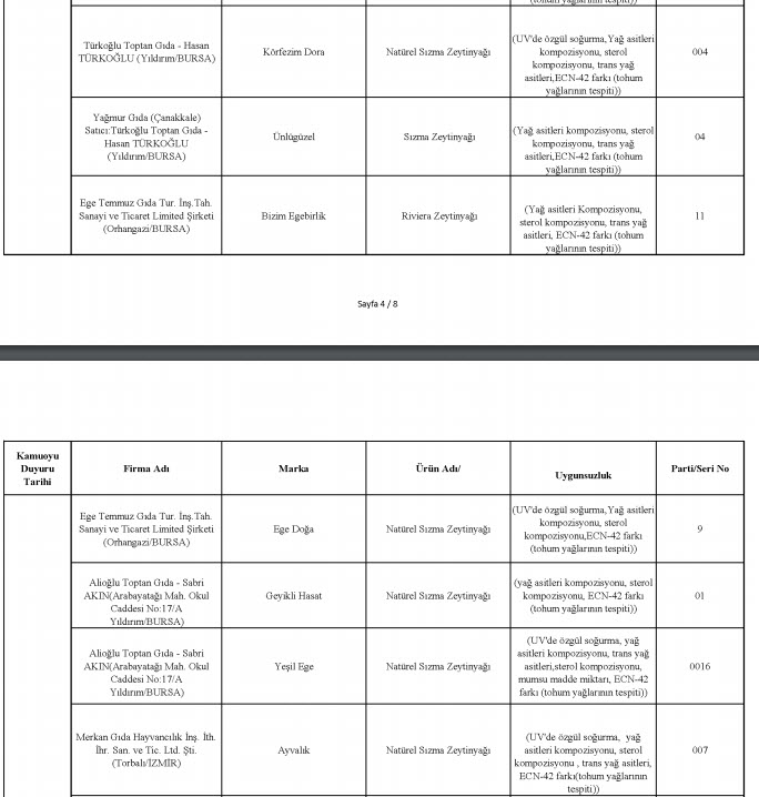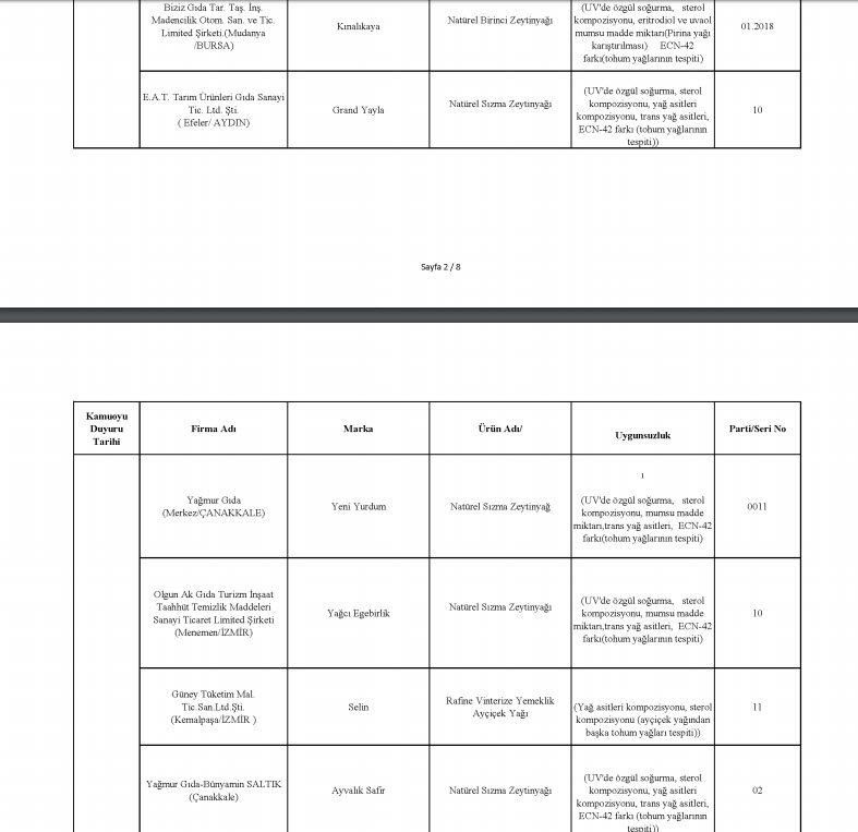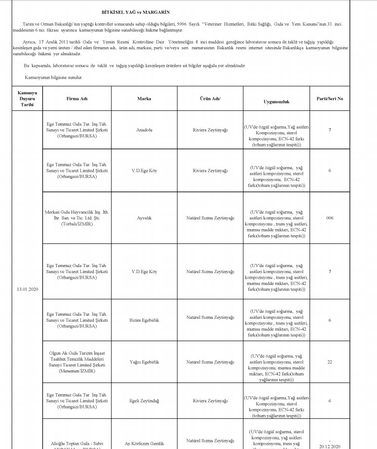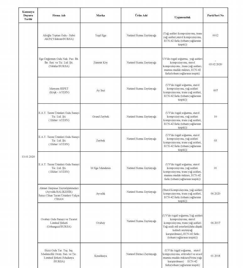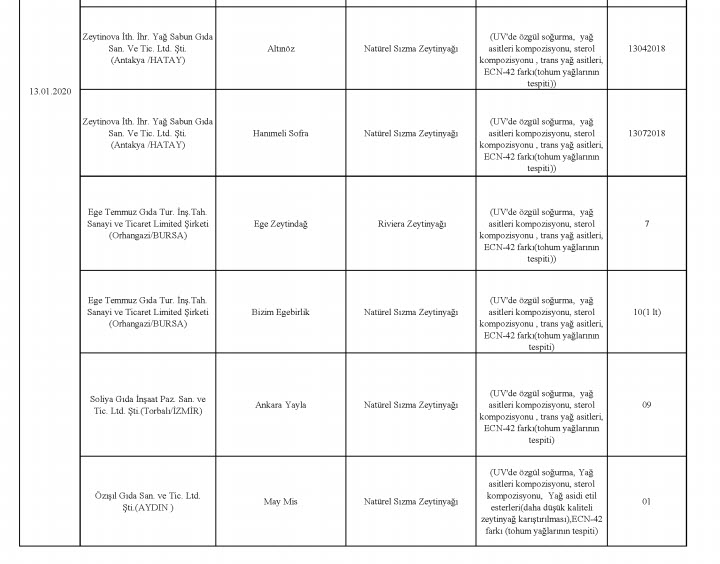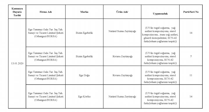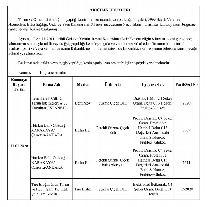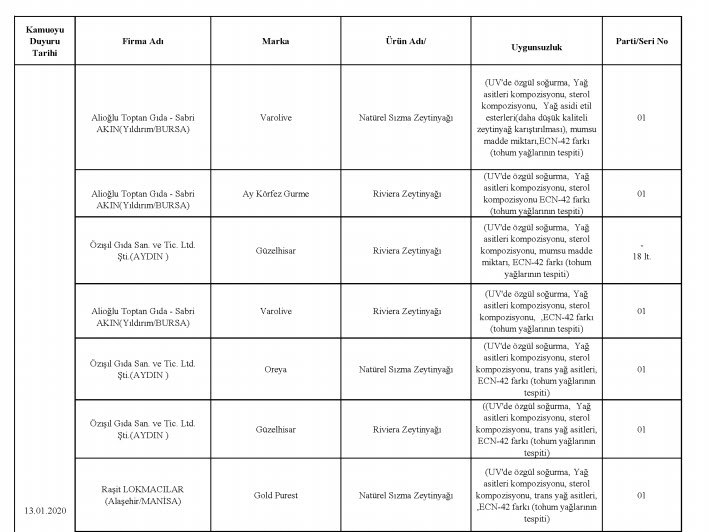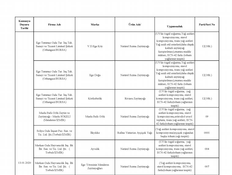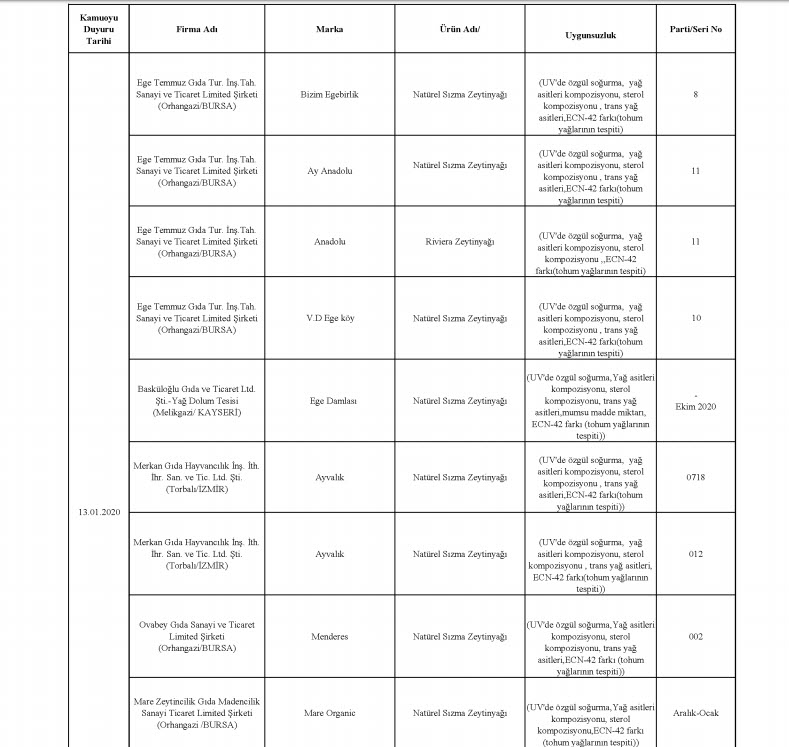 Tarım ve Orman Bakanlığı, taklit, tağşiş veya ilaç etken maddesi tespit edilen toplam 229 firmaya ait 386 parti ürünü kamuoyuyla paylaştı. En fazla uygunsuzluk tespit edilen ürünlerin et ve et ürünleri (domuz eti, tek tırnaklı eti, at eti), zeytinyağı (tohum yağları), süt ve süt ürünleri (jelatin, bitkisel yağ) olduğu dikkat çekerken, son liste ile birlikte 2012 yılından bu yana 1443 firmaya ait 3202 parti ürün tüketicilerin bilgisine sunulmuş oldu.