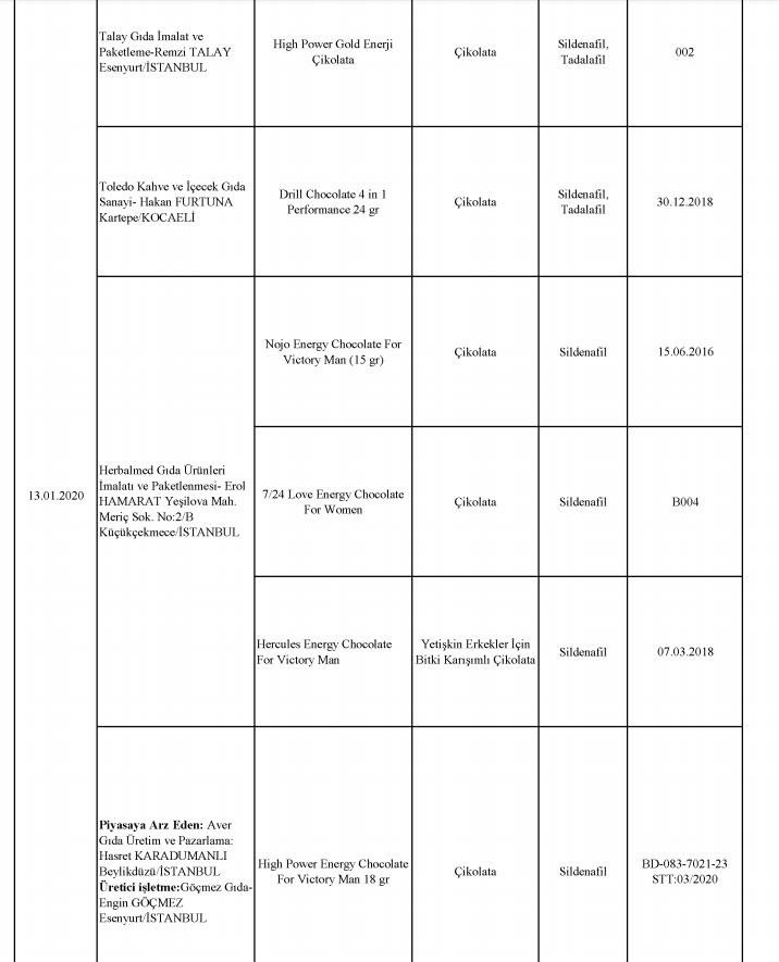 229 firmaya ait 386 parti üründe taklit ve tağşiş yapıldığı tespit edildi. Listede bulunan bazı markaların vatandaşa domuz ve at eti yedirdiği, bazı markaların da çaya boya karıştırdığı ortaya çıktı. 2012 yılından bu yana 1443 firmaya ilişkin 3202 parti üründe taklit ve tağşiş yapıldığı da belirtildi.