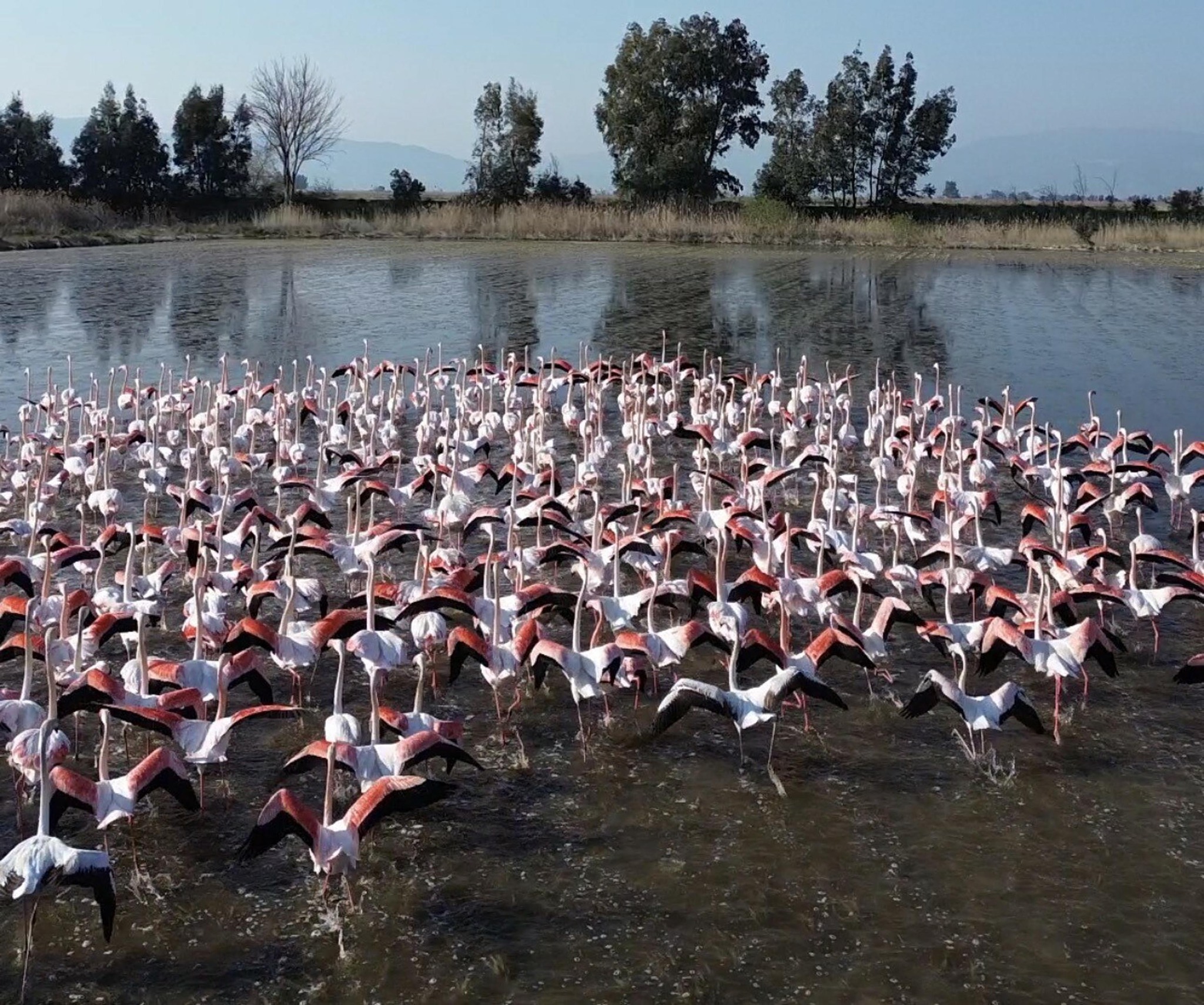 Aydın'ın Söke ilçesinde, sağanakla birlikte Büyük Menderes'in taşması sonucu göle dönen tarlalar, flamingoların uğrak yeri oldu. Suyla dolu tarlalardaki flamingolar, dronla görüntülendi.