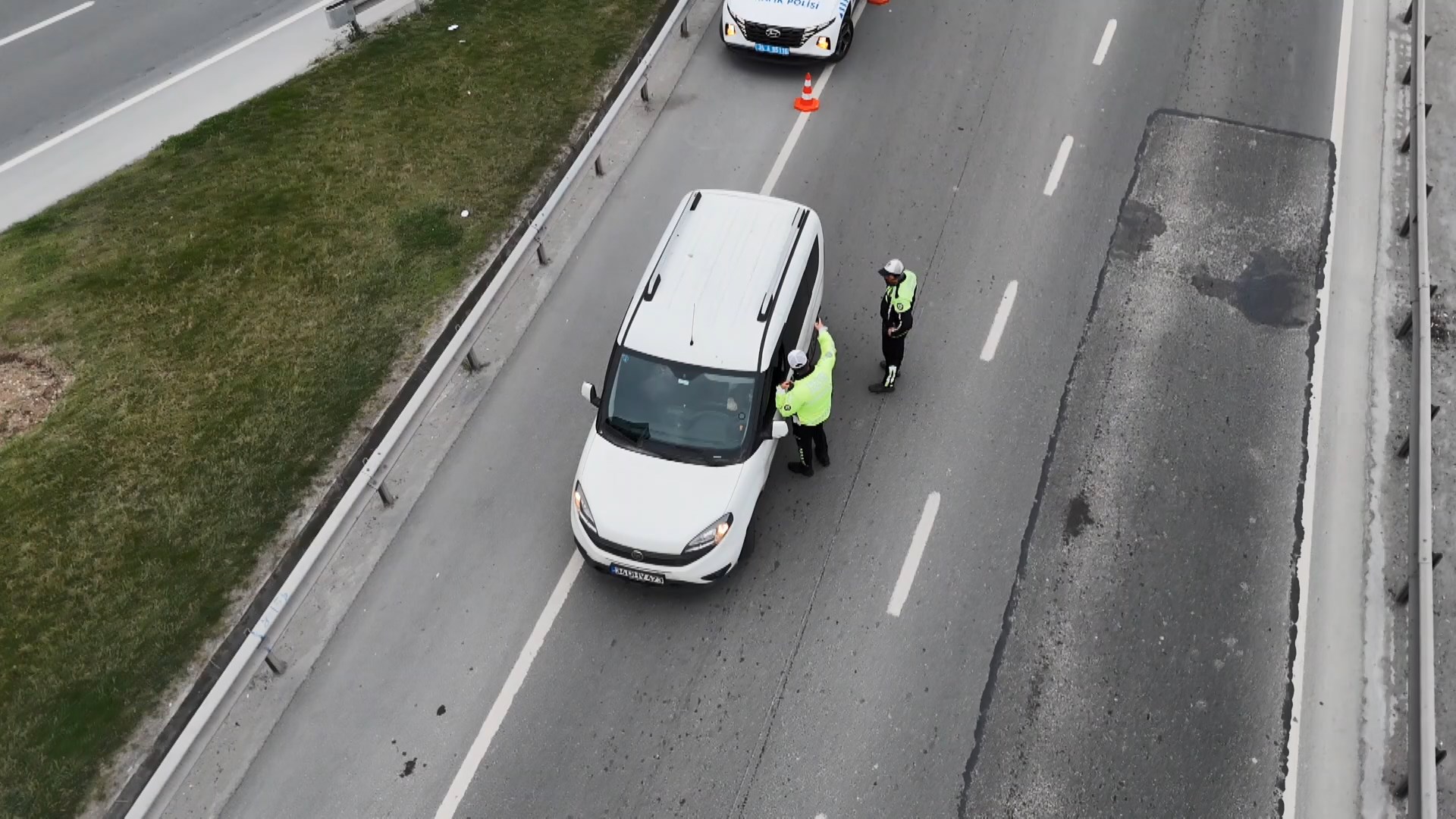 Dron ile havadan yapılan takip sonucu kural ihlali yaptığı tespit edilen araçlar, ileride oluşturulan kontrol noktasında ekiplerce durduruldu. Kurallara aykırı şekilde şerit düzenini bozarak ilerleyen sürücüler belirlendi.