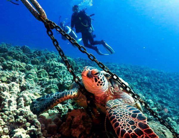 Bodrum'un Havai'si olarak bilinen ilçeye 9 mil mesafedeki Orak Adası'na demirleyen yatlardan birinin çıpa demirine sıkışan caretta caretta olduğunu gören turistler, az ilerdeki başka bir teknedeki dalgıçlardan yardım istedi.
