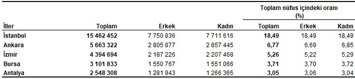 İstanbul'un nüfusu, bir önceki yıla göre 56 bin 815 kişi azalarak 15 milyon 462 bin 452 kişiye düştü. Türkiye nüfusunun %18,49'unun ikamet ettiği İstanbul'u, 5 milyon 663 bin 322 kişi ile Ankara, 4 milyon 394 bin 694 kişi ile İzmir, 3 milyon 101 bin 833 kişi ile Bursa ve 2 milyon 548 bin 308 kişi ile Antalya izledi.