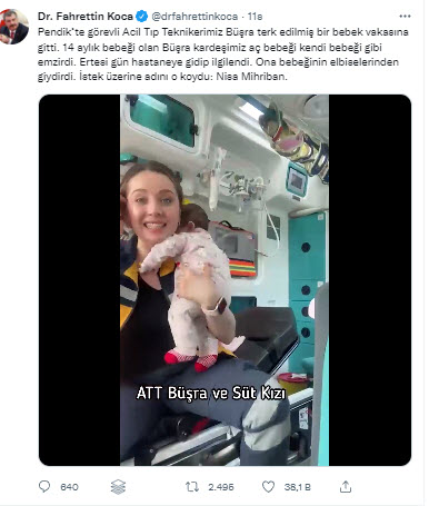 14 aylık bebeği olan sağlık çalışanı Büşra Durmaz terk edilmiş bebeğin süt annesi oldu, istek üzerine adını koydu. Sağlık Bakanı Fahrettin Koca da "ATT Büşra ve süt kızı" videosunu hesabından paylaştı. 29 yaşındaki sağlık çalışanı Durmaz, kızını yeni yuvasına bıraktığını belirterek, "Kendi öz kızımı emziriyormuş gibi hissettim. Çok çaresiz bir bebek var karşınızda. Hiç bırakmak istemedim. Artık bir kızım daha var. Ona bazı şeyler yazdım. Ziyarete gideceğim ve ulaştıracağım" dedi.