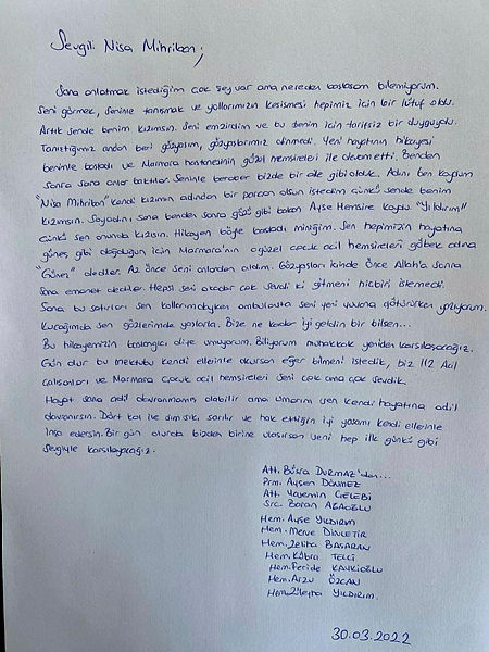 Terk edilmiş Nisa Mihriban bebeğe süt annelik yapan Acil Tıp Teknikeri Büşra Durmaz, olay günü yaşananları şu sözlerle anlattı: "Olay yerine gittiğimizde asayiş ekipleri olay yerindeydi. Bebeği ekip otosundan aldık. Muayene yaptığımız esnada sürekli ağlıyordu ve emme isteğinde bulunuyordu. Ağzıyla, başını sağa sola çevirip dilini çıkartıyordu. Sonra ben de bu isteğine karşılıksız kalamadım. Emzirmek istedim. Aldım, emzirdim. Hastaneye geldik ve biraz da hastanenin önünde emzirmeye devam ettim. Yirmi dakika boyunca emzirdim. Bebeği hastaneye teslim ettik. Mesaim bittikten sonra eşimle tekrar hastaneye bebeği görmeye gittik. Tekrar gördüm."