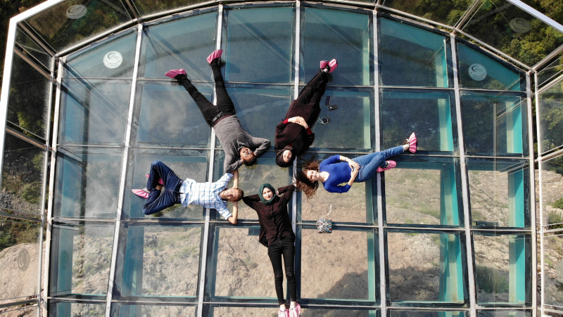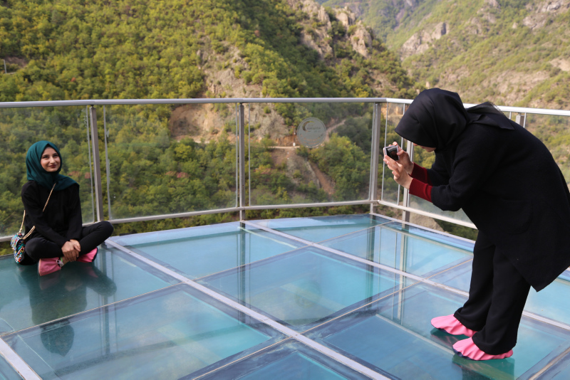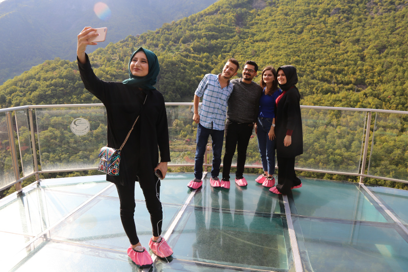 Cam seyir terasının üzerinde ziyaretçiler ilk deneyimlerinde heyecan ve tereddüt yaşarken bir süre sonra da eşsiz doğa manzarasının keyfini çıkarıyor.