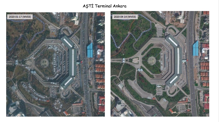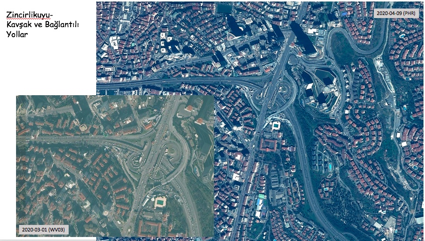 Bu kapsamda, Türkiye'nin 5 büyükşehrindeKovid-19 salgını öncesi ve sonrasında farklı uydular aracılığıyla kaydedilen görüntüler, özellikle son haftalarda salgınla mücadele kapsamında alınan tedbirlere ve "evde kal" çağrılarına büyük oranda uyulduğunu gösteriyor.