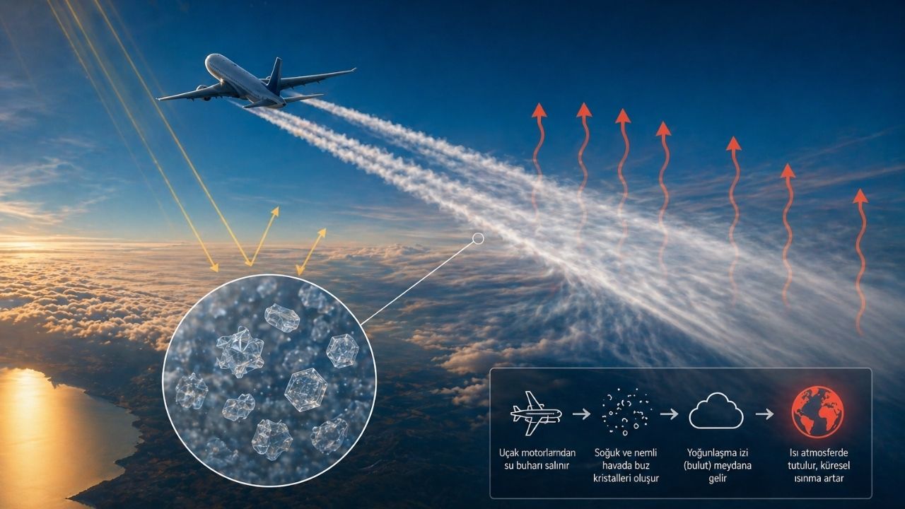 Uçakların gökyüzünde bıraktığı beyaz izler, yani yoğunlaşma izleri, iklim üzerinde doğrudan ısıtıcı etki oluşturuyor. Bu izler kısa ömürlü olsa da geniş alanlara yayıldığında güçlü bir ısınma etkisi yaratıyor. Özellikle yoğun hava trafiğinin olduğu bölgelerde bu etki belirginleşiyor. Bilimsel veriler, uçuşların iklim üzerindeki toplam etkisinde bu izlerin kritik rol oynadığını gösteriyor.