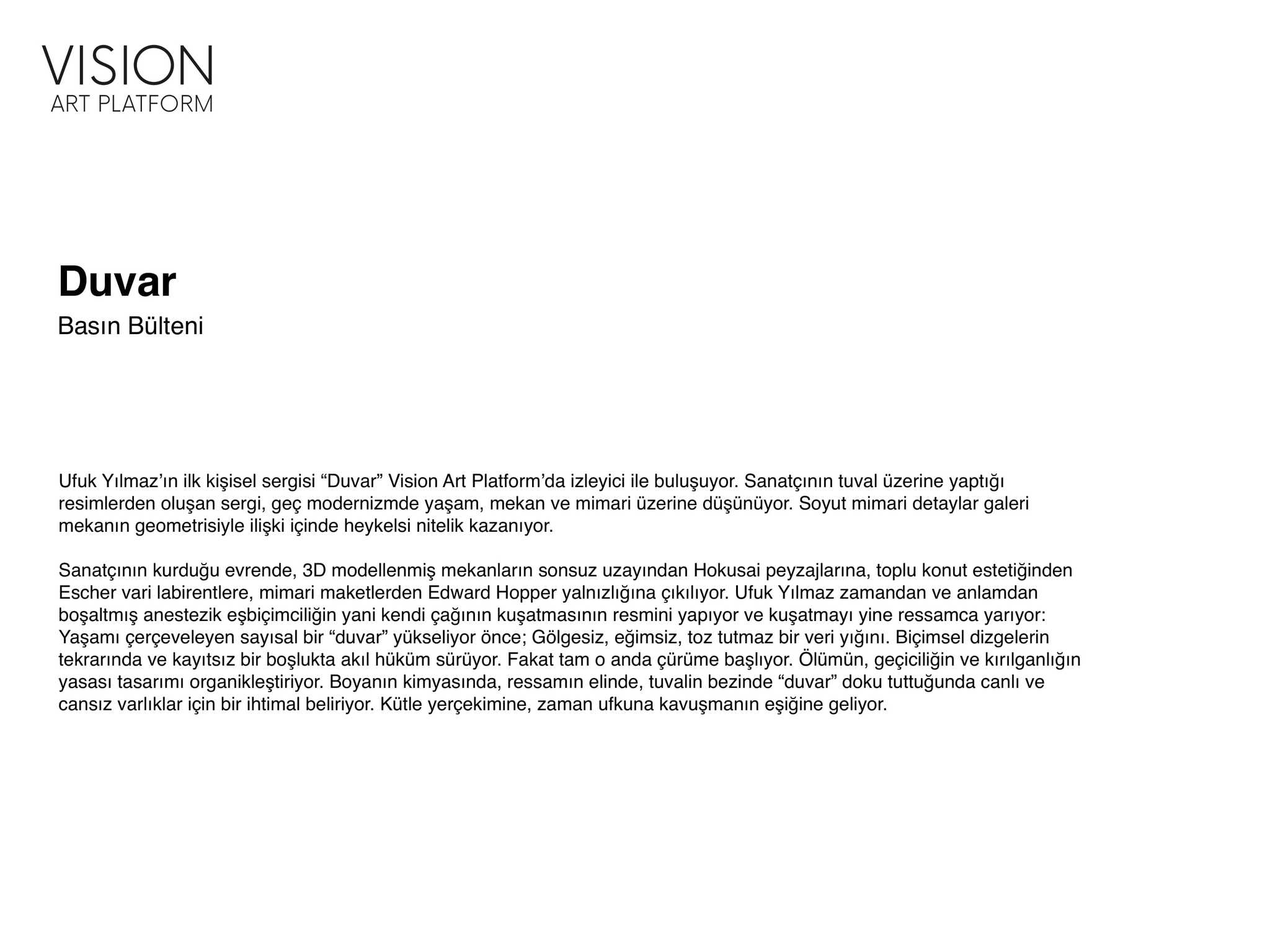 Ufuk Yılmaz'ın ilk kişisel sergisi "Duvar" Vision Art Platform'da izleyici ile buluşuyor. Sanatçının tuval üzerine yaptığı resimlerden oluşan sergi, geç modernizmde yaşam, mekan ve mimari üzerine düşünüyor.