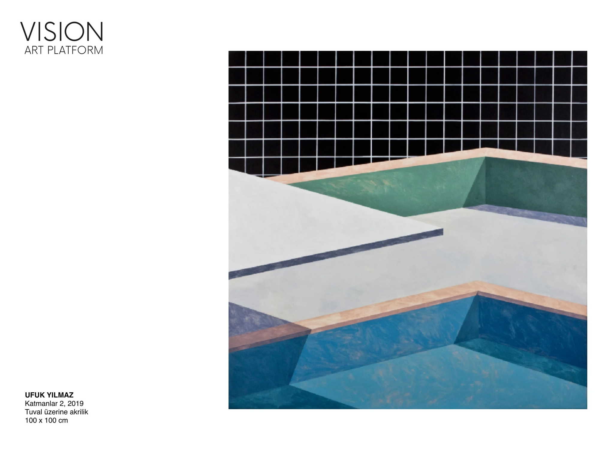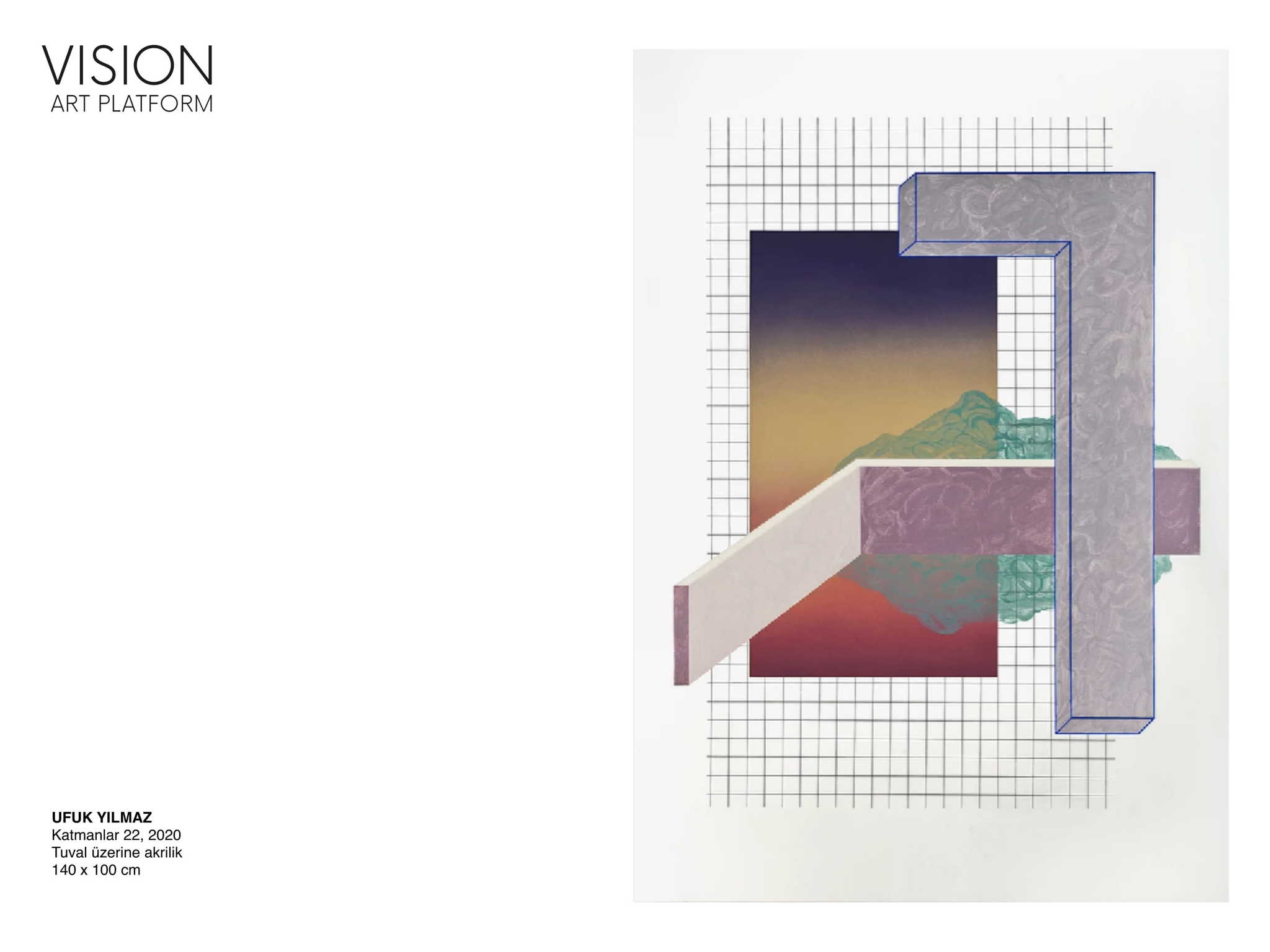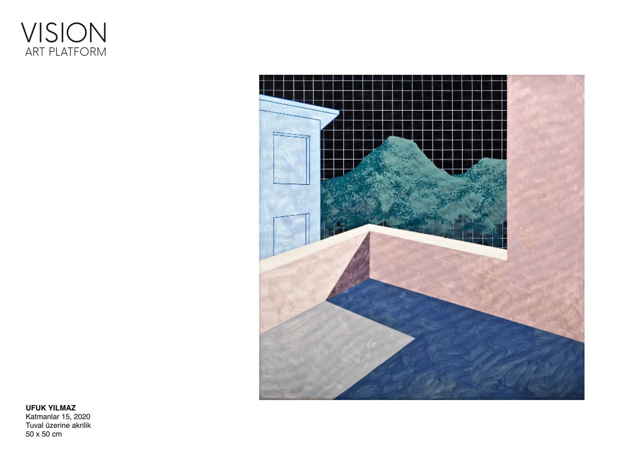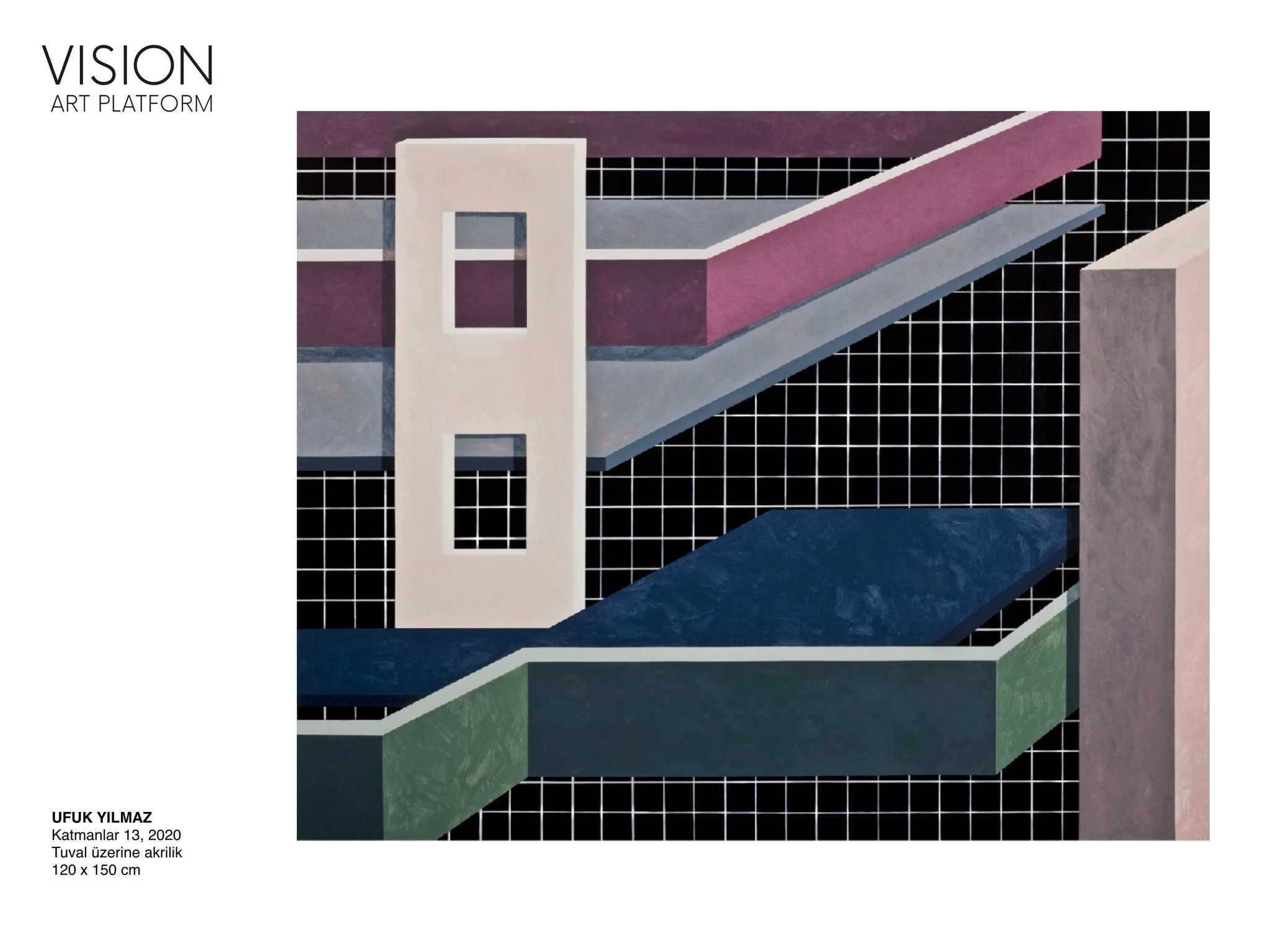 Ufuk Yılmaz soyut mimari detaylar galeri mekanın geometrisiyle ilişki içinde heykelsi nitelik kazanıyor. Sanatçının kurduğu evrende, 3D modellenmiş mekanların sonsuz uzayından Hokusai peyzajlarına, toplu konut estetiğinden Escher vari labirentlere, mimari maketlerden Edward Hopper yalnızlığına çıkılıyor.