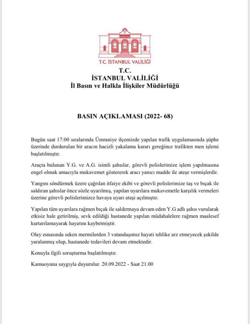 "Yapılan tüm uyarılara rağmen bıçak ile saldırmaya devam eden Y.G. adlı şahıs vurularak etkisiz hale getirilmiş, sevk edildiği hastanede yapılan müdahalelere rağmen maalesef kurtarılamayarak hayatını kaybetmiştir.
