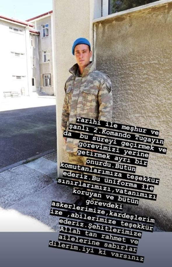 Ünlü oyuncu fotoğrafın altına; Tarihi ile meşhur ve şanlı 2.Komando Tugayında bu süreyi geçirmek ve görevimizi yerine getirmek ayrı bir onurdu. Bütün komutanlarımıza teşekkür ederiz. Bu üniforma ile sınırlarımızı, vatanımızı koruyan ve bütün görevdeki askerlerimize, kardeşlerimize, abilerimize teşekkür ederiz. Şehitlerimize Allah'tan rahmet ve ailelerine sabırlar dilerim. İyi ki varsınız.' Notunu düştü.