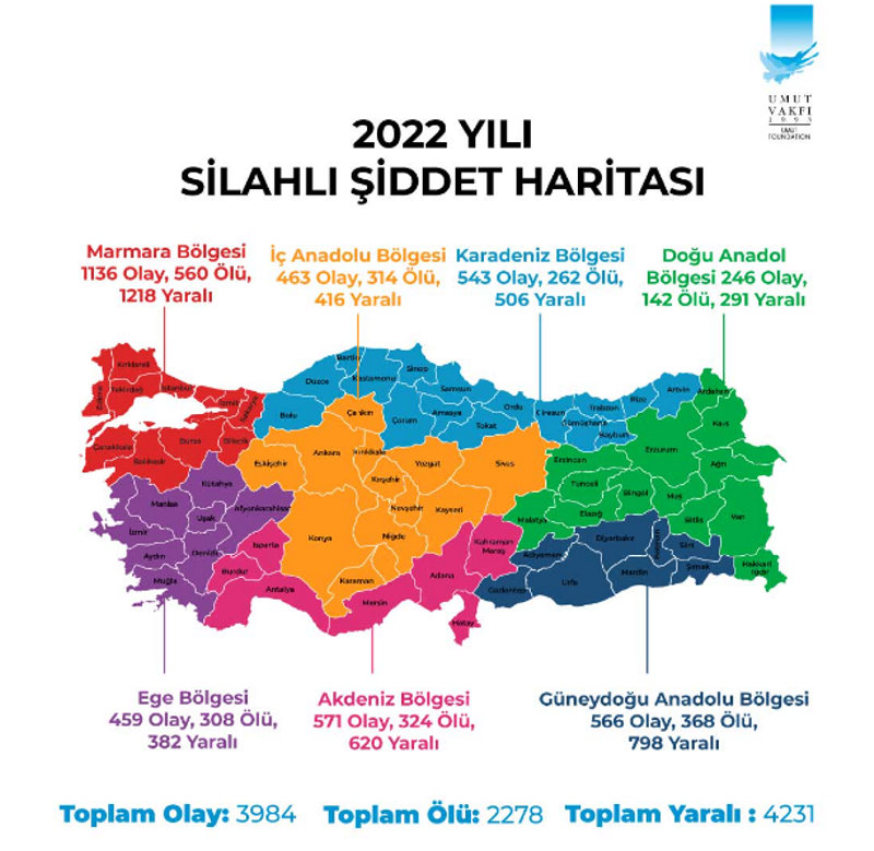 Bireysel silahlanma karşıtı Sivil Toplum Kuruluşu olan Umut Vakfı'nın verisine göre son beş yılda 18 bin 769 kişinin silahla öldürüldüğü belirtiliyor. Türkiye'de 36 milyon silah olduğunu, bu silahlardan sadece 4 milyonunun ruhsatlı olduğunu belirten Umut Vakfı Yönetim Kurulu Üyesi Psikiyatri Uzmanı Dr. Ayhan Akcan SABAH yaptığı açıklamada istatistiki verileri paylaşarak "Asayiş tedbirlerine, cinayette kullanılan silahlara, adli tıp otopsi raporlarına ve vakıf olarak bir yıllık silah şiddeti raporları verilerine bakıldığında olaylarda ruhsatsız- ruhsatlı silah oranı 9'da 1. Yani 9 ruhsatsız, bir ruhsatlı çıkıyor. Asayiş veya silah şiddeti dediğimiz, silahla ilgili suçlarda da artış var. Her gün maalesef en az 10 vatandaşımız ölüyor, 20 vatandaşımız yaralanıyor. 10 yıl önce cinayet vakalarında yüzde 50 silah kullanılırken, şu anda yüzde 85'inde silah kullanılıyor. Her yıl yüzde 3.5 civarında hem silahla ilgili işlenen suçlarda hem de silah edinim sayısının da arttığını tespit ettik" diyor.