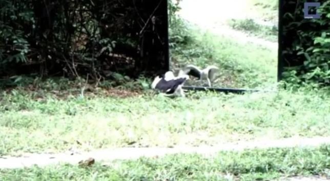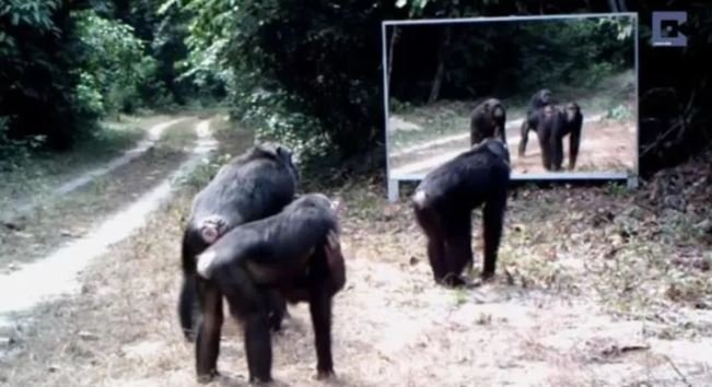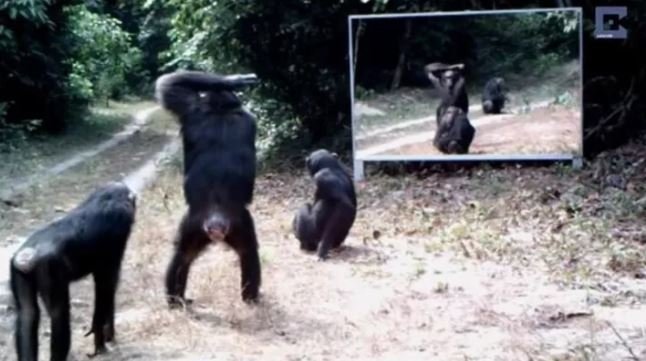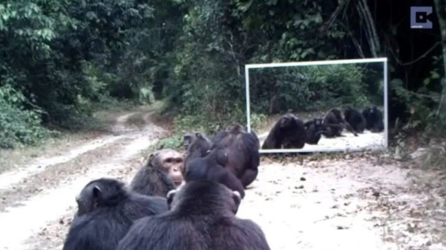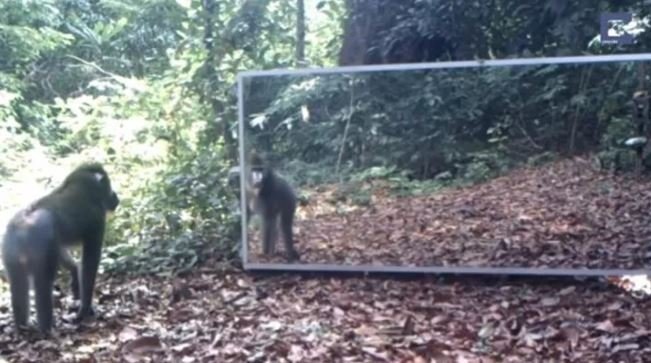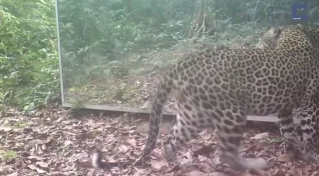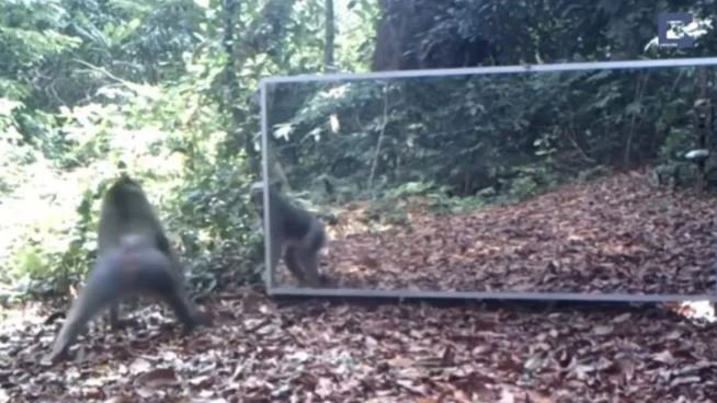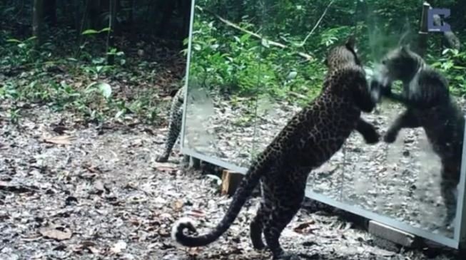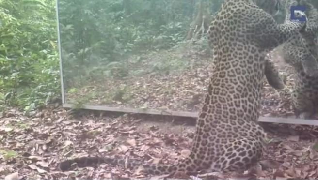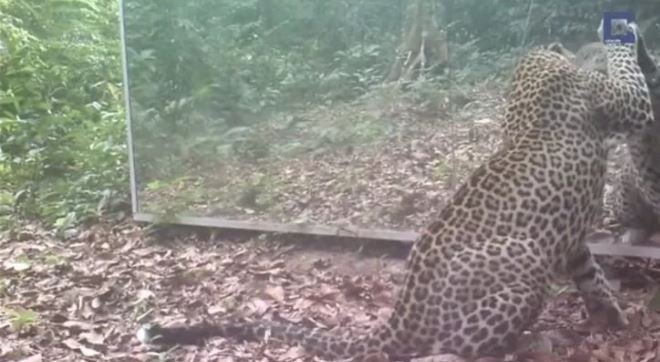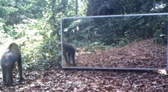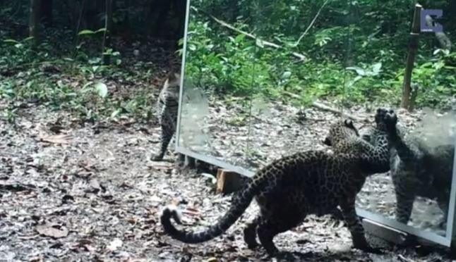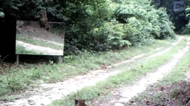 Ormana ayna yerleştiren belgeselciler hayvanların tepkisini merak ederken o anları saniye saniye görüntüledi.