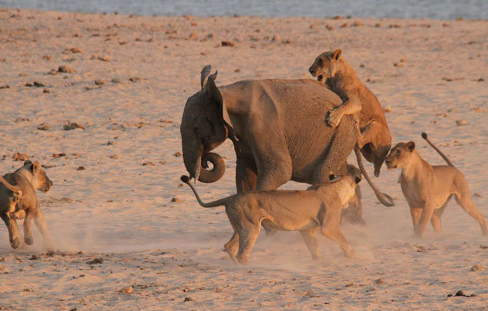 Videoda aslanların fili nasıl pençelediği ve sıçrayarak nasıl sırtına çıktıkları açıkça gözüküyor. Yavru fil de kendini savunmaya ve sayıca epey üstün olan saldırganlardan yakasını kurtarmaya çalışıyor.