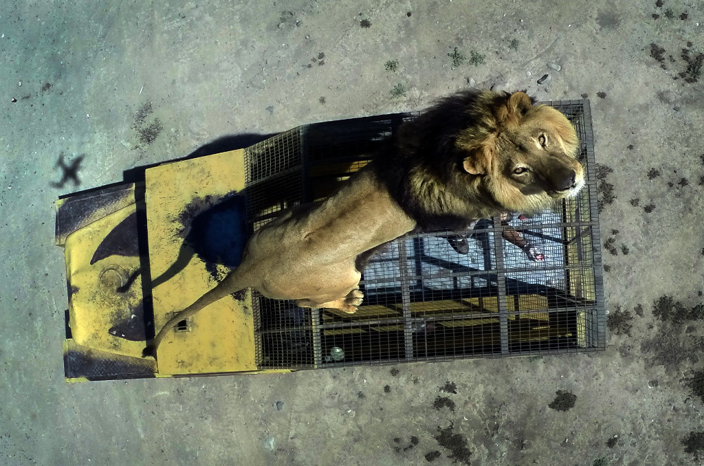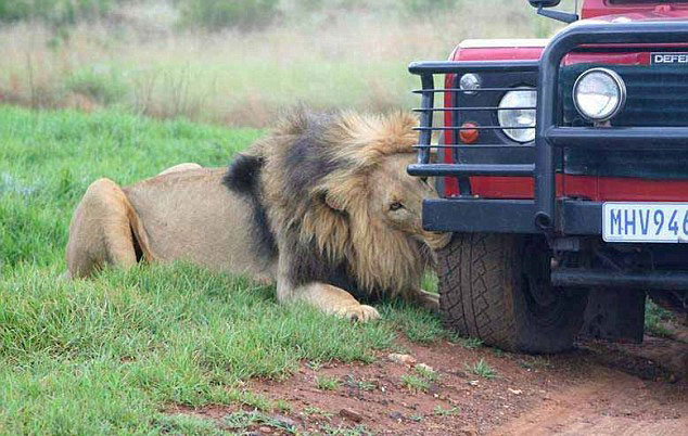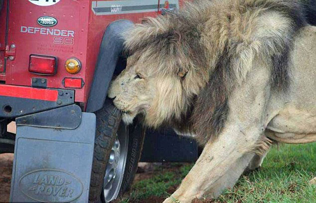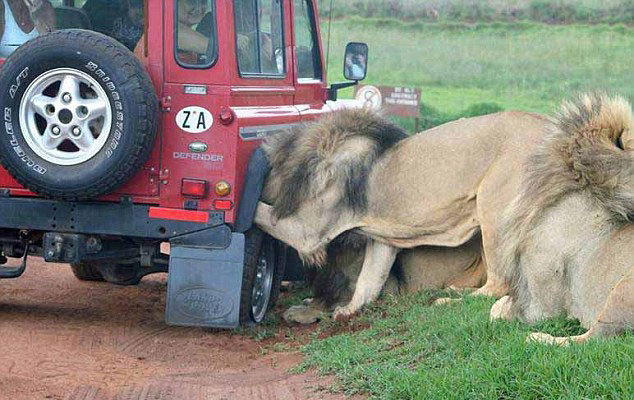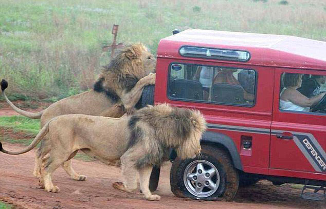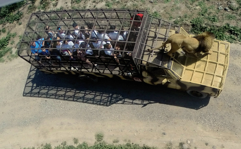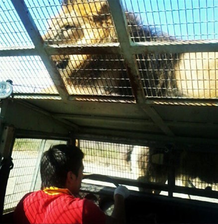 Kafes şeklinde tasarlanan araçlarla yapılan safaride insanlar çok yakın bir mesafeden aslanları görebiliyor.