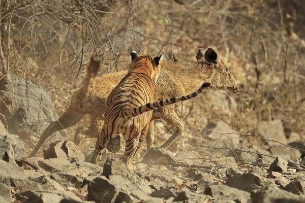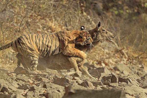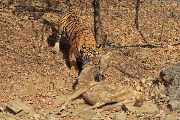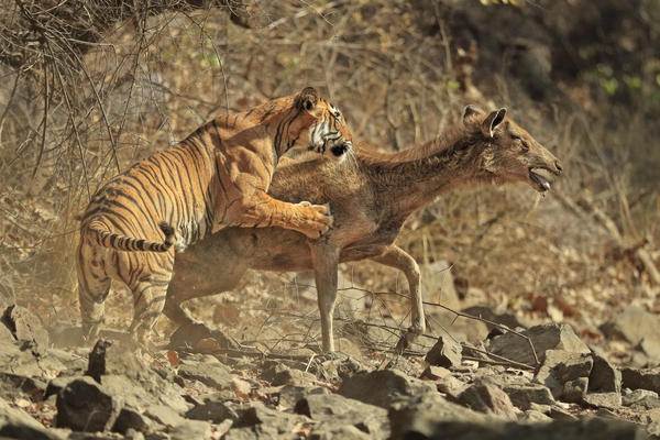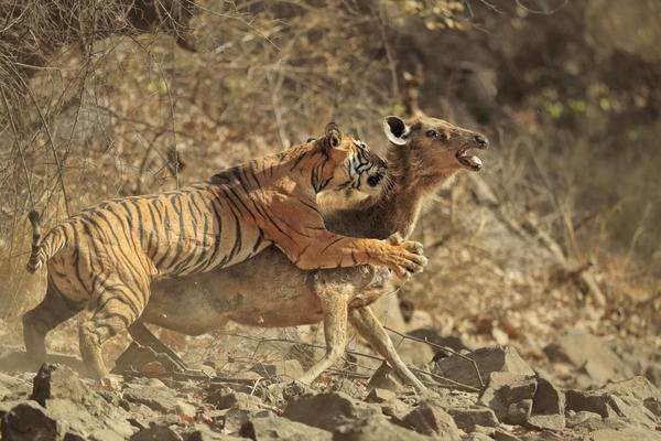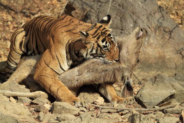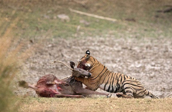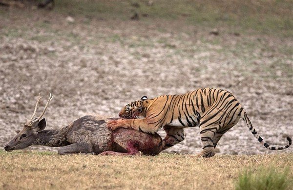 Dişi bir kaplanın saldırısına uğrayan geyik, 15 dakika boyunca bu saldırıya direndi ama en sonunda pes etti.
