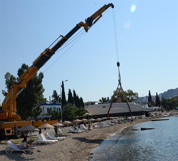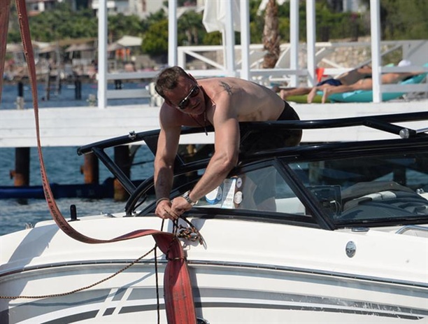 Murat Başoğlu, yeni aldığı sürat teknesini önceki gün vinç yardımıyla suya indirdi. Murat Başoğlu, yeni aldığı sürat teknesini önceki gün vinç yardımıyla suya indirdi. Tekne henüz havadayken içinde Başoğlu'nu görenler büyük şaşkınlık yaşadı.