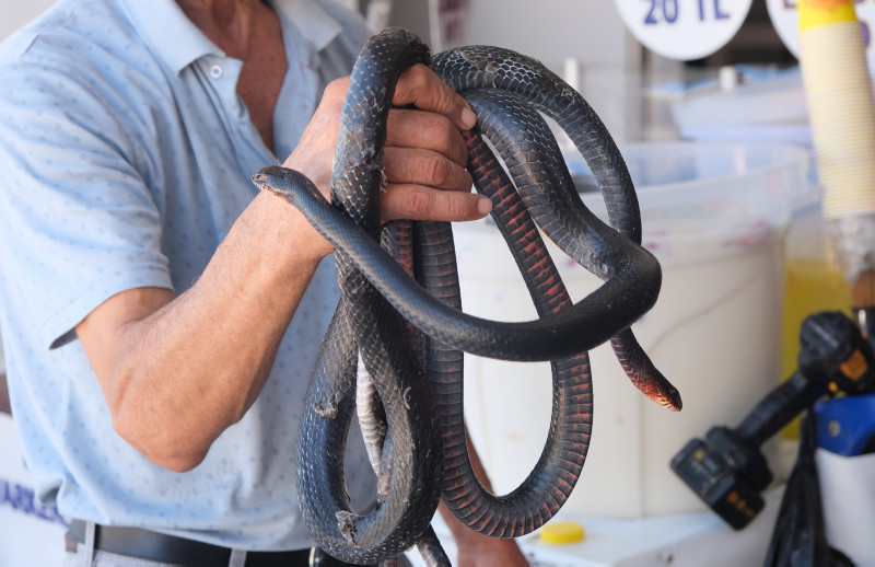 Adana Otogarı'nda uzun yıllardır çiğköfte satarak geçimini sağlayan 62 yaşındaki Osman Aslan, koynunda beslediği yılanlar ile şov yaparken saldırıya uğradı. O anlar cep telefonu kamerasıyla kaydedilirken Aslan, "Koynumda bile yılan besliyorum. Onlara ciğer, kurbağa yedirip süt içiriyorum" dedi.