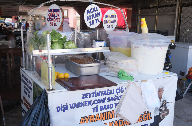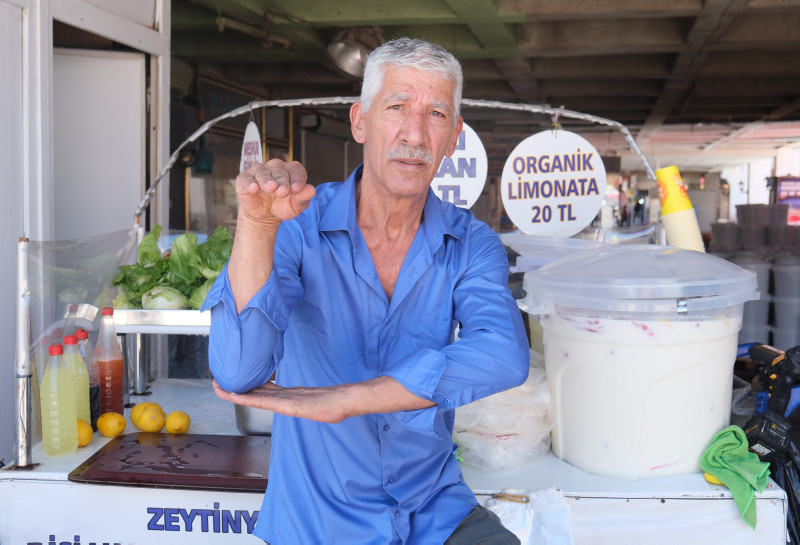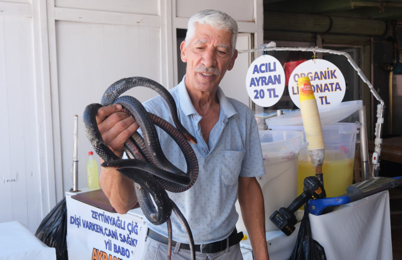 Adana Otogarı'nda uzun yıllardır çiğköfte satarak geçimini sağlayan Osman Aslan'ın (62) yılan sevgisi görenleri hayrete düşürüyor.