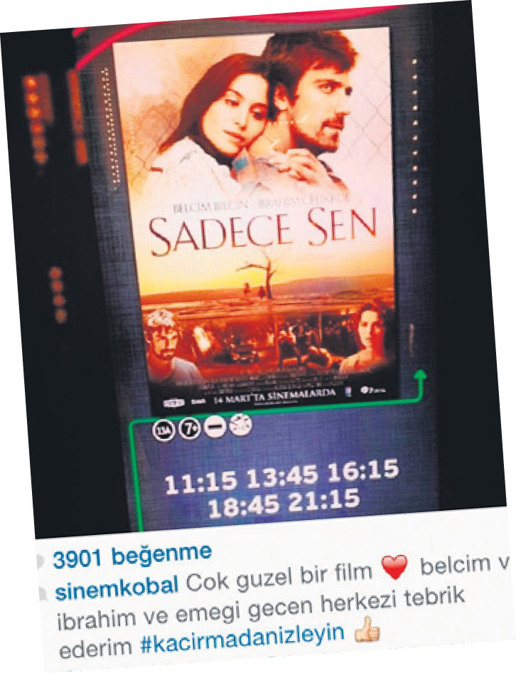 SİNEM Kobal, Belçim Bilgin ve İbrahim Çelikkol’un rol aldığı filmin galasına da katıldı. Sevgilisinin davetlisi olarak galaya giden Kobal, sosyal medyadan da “Sadece Sen” filmine övgü yağdırdı. Sinem Kobal, filmin afişini instagram’da paylaşıp “Çok güzel bir film. Belçim, İbrahim ve emeği geçen herkesi tebrik ederim” diye yazarken ‘kalp’ işareti yapmayı da ihmal etmedi.