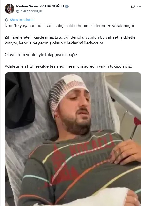 Kocaeli'de yüzde 85 otizmli ve epilepsi hastası olan 32 yaşındaki Ertuğrul Şenol, bisikletle gezerken bir fırının odunluğuna baktığı gerekçesiyle darbedildi. Başına 6 dikiş atılan ve kolu alçıya alınan Şenol'un kardeşi Yuşa Şenol, "Hastaneye vardığımızda ağabeyimi tanıyamadım. Vicdan sahibi bir insan böyle bir şey yapmaz" diyerek tepki gösterdi.