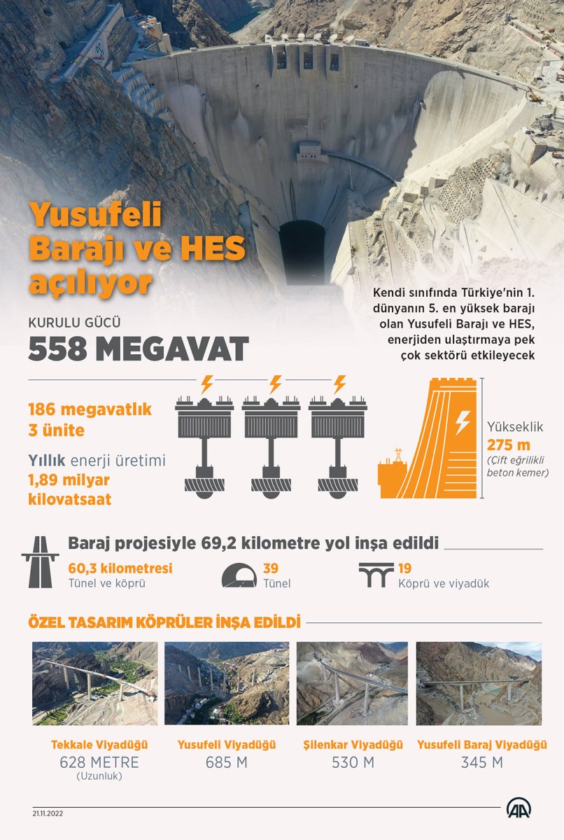 Temeli 26 Şubat 2013'te atılan, 275 metre gövde yüksekliği ile Türkiye'nin en yüksek, dünyanın 5'inci en yüksek barajı Yusufeli Barajı inşası tamamlandı. Baraj inşaatı ve ilçe merkezi ile köylerdeki 5 bin konut, 270 iş yeri ve 9 bin 430 dönüm tarım arazisi, sular altında kalacak.