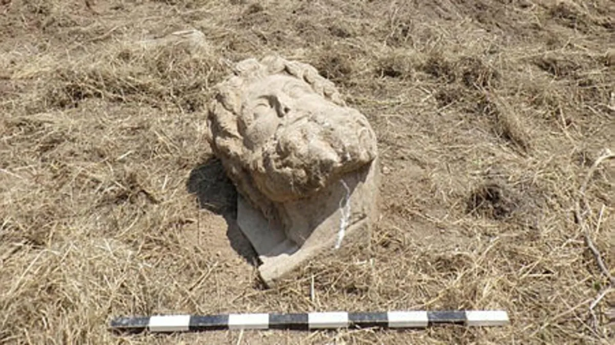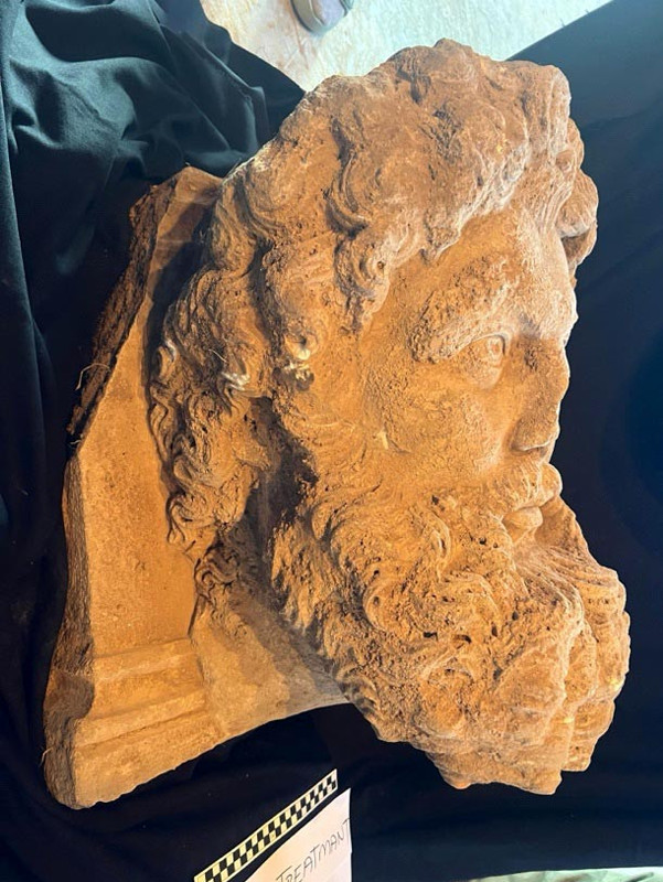 Mimari bir konsol ya da konsolun parçası olarak kabartma şeklinde oyulmuş sakallı kolosal mermer baş, Aphrodite Tapınağı'nın 50 metre batısındaki alanda, yüzeyin yakın bir seviyesinde ters dönmüş şekilde bulundu.
