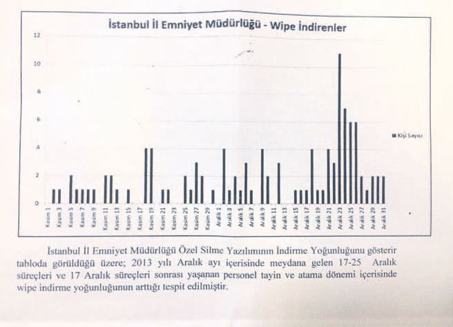 Paralel Yapı'ya yönelik 20 kentte düzenlenen operasyonda gözaltına alınan, eski İstanbul Emniyet Müdür Yardımcısı Mahir Çakallı ile eski İstanbul Organize Suçlarla Mücadele Şube Müdürü Nazmi Ardıç da dahil 29 kişilik çetenin, meslektaşları ve gazeteciler gibi kendilerine dinleme izni vermeyen bir mahkeme başkanını da fuhuş çetesine bağlayıp dinlediği belirlendi. Çetenin ayrıca, casusluk suçu kapsamına giren yöntemlerle İstanbul İstihbarat Şube'yi Temmuz 2013'ten itibaren 5 ay dinlediği, dinlemelerin özellikle 17-25 Aralık sürecinde yoğunlaştığı, şubedeki bilgisayarlarda bulunan 34 ayrı soruşturmaya ilişkin veri ve tapelerin ise depolandıkları TİBNOT'tan sildiği ortaya çıktı. Geri dönüşü mümkün kılmayan Vipe ve Rvipe adlı programlarla yapılan silme işlemlerinin yoğunlaştığı günler, müfettişlerce grafiğe döküldü. En çok silmenin yapıldığı tarihlerse 23-24-25 Aralık...