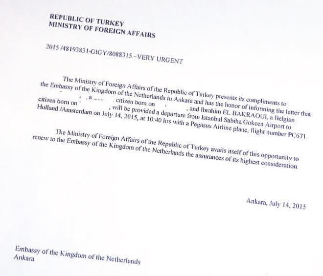 Uluslararası haber ajansı AP dün, Türk yetkililerin Hollanda Konsolosluğu'na gönderdiği terörist İbrahim Bakravi hakkındaki yazının belgesini yayınladı. "Çok Acil" koduyla geçilen belgede Türkiye Dışişleri Bakanlığı'nın 14 Temmuz 2015'te Hollanda'nın Ankara Başkonosluğu'na yazı geçerek İbrahim Bakravi'nin belirtilen saatte Amsterdam Havalimanı'na ineceğini belirtti. Yazıda konudan Belçika'nın haberdar edilmesi gerektiği ve bu sınırdışı etme işleminin yüksek derecede önemli olduğu belirtildi. Türk makamları daha sonra hem Hollanda hem Belçika makamlarına sözlü uyarı da yapmıştı.