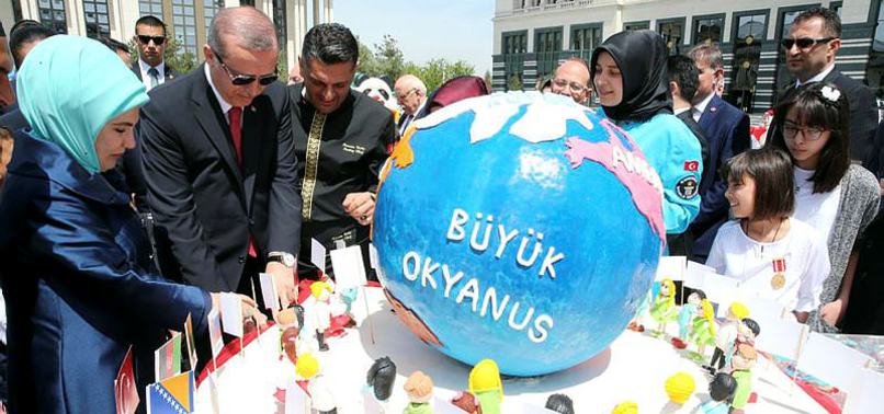 Erdoğan, misafir ettiği çocuklarla, dünya küresi şeklinde hazırlanan pastanın boş bırakılan bölümüne Türkiye haritasını yerleştirdi. Erdoğan ve eşi Emine Erdoğan, 23 Nisan için özel hazırlanan pastayı çocuklarla birlikte kesti.