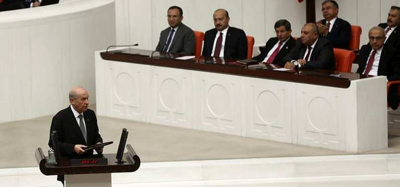 Kürsüye gelirken Meclis Başkanlık Divanı'nın hükümet sıralarını başıyla selamlayan Bahçeli, locadaki Cumhurbaşkanı'na da başıyla selam verip sözlerine, "Sayın Cumhurbaşkanım" diye başlayınca Ak Parti sıralarından alkış yükseldi.
