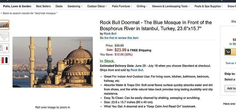 Online satış şirketi Amazon, üzerinde Kuran-ı Kerim ve Kabe fotoğrafları olan kapı paspaslarını satıştan kaldırırken, camili olanlar ise halen sitede bulunuyor.