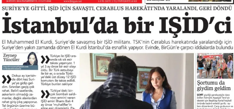 PKK ve FETÖ'ye verdiği destekle bilinen BirGün gazetesi bugün "IŞİD"çi olduğu iddiasıyla yüzü maskeli bir isimle röportaj yaparak terör propagandası yaptı. Bir de kod adı bulduğu sözde 'DAEŞ' mensubunun sözlerini "çarpıcı açıklamalar" şeklinde niteleyerek veren gazete Türkiye'yi suçlayan cümlelere yer verirken yıllardır savunduğu "Türkiye DAEŞ'e yardım ediyor" tezini de kendi eliyle boşa çıkarmış oldu.