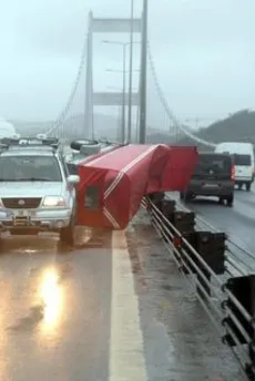 İstanbul'da sabah saatlerinde etkisini artıran şiddetli rüzgar nedeniyle Fatih Sultan Mehmet Köprüsü (FSM) üzerinde, Hasan Akkurt yönetimindeki otomobile bağlı tenteli römork savrularak bariyerlerin üzerine devrildi.
