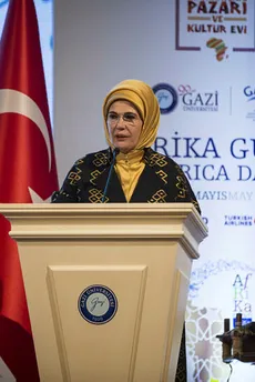 Gazi Üniversitesi Akdeniz Havzası ve Afrika Medeniyetleri Uygulama ve Araştırma Merkezi tarafından "Afrika El Sanatları Pazarı ve Kültür Merkezi Projesi"ne himayelerinden dolayı "Yılın Kişisi" ödülü verilen Emine Erdoğan, 25 Mayıs Afrika Günü vesilesiyle düzenlenen etkinlikte katılımcılarla bir araya gelmekten memnuniyet duyduğunu belirterek, herkesin 25 Mayıs Afrika Günü'nü kutladı. Geçtiğimiz yıl Afrika Günü'nde Afrika dostluğunun nişanesi olarak bir sosyal sorumluluk projesi başlattıklarını ifade eden Erdoğan bu proje kapsamında Başkent'in tarihi semti Hamamönü'nde Afrika El Sanatları Pazarı ve Kültür Evi'nin açılışını yaptıklarını kaydetti. Afrika Evi'nin Afrika'ya yaptıkları ziyaretin güzel bir meyvesi olduğunun altını çizen Erdoğan, "Afrikalı kadınların güçlendirilmesi için yapılan bu projenin bugün kuruluş yıl dönümünü kutluyoruz. İnanıyorum ki daha nice Mayıs aylarında çeşitli vesilelerle Afrika Günlerinde buluşmaya devam edeceğiz. Bu vesileyle ilk günden bu yana projemize katkı veren tüm kurum ve kuruluşlara teşekkür ediyorum. Bugünkü programın ev sahibi Gazi Üniversitesi'ne ve Afrika Medeniyetleri Uygulama ve Araştırma Merkezi'ne teşekkürlerimi sunuyorum. Afrika kıtasını şemsiyesi altında bulunduran Afrika Birliği Örgütü'nün kuruluş tarihi olan 25 Mayıs vesilesiyle heyecanımızı buradan inşallah yeniden tazeleyeceğiz. Bu güzel günde bizleri yanımızda bırakmayan Afrika Birliği Dönem Başkanı Gine'nin değerli hanımefendisi Conde ağırlamaktan da ayrıca büyük bir memnuniyet duyuyorum" şeklinde konuştu.