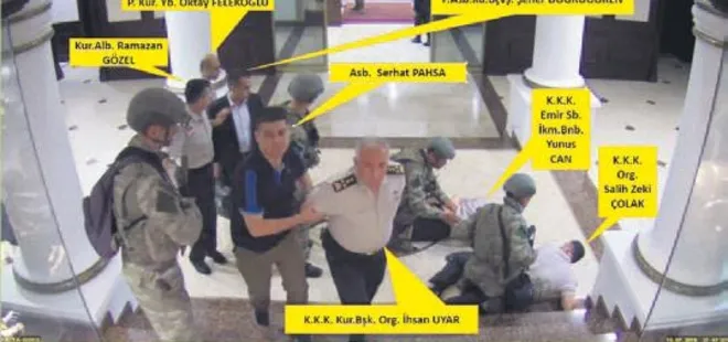 DİRENENLERİ UZAKLAŞTIRTIYOR (22:18): Zeki Çolak ve diğer 2 general kapıdan çıkarıldıktan sonra Serhat Pahsa, darbecilere karşı çıkan ve bu nedenle elleri arkadan kelepçelenerek yere yatırılan görevlilerin uzaklaştırılması talimatını veriyor.