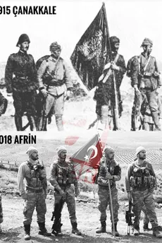 Afrin'de kontrolü tamamen ele geçiren kahraman Mehmetçiklerimiz 1 asır önce Çanakkale'de çekilen bir fotoğrafta olduğu gibi elde sancak ve bayrak ile Afrin tepelerinden hem şehitlere hem de Türkiye'ye selam gönderdi.