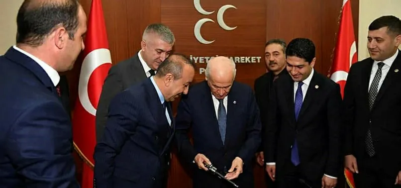 Kayseri'nin Pınarbaşı Belediye Başkanı Memduh Uzunoğlu, MHP Genel Başkanı Devlet Bahçeli'yi ziyaret edip, 149 yıllık tabanca hediye etti.