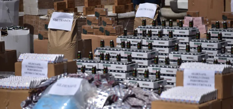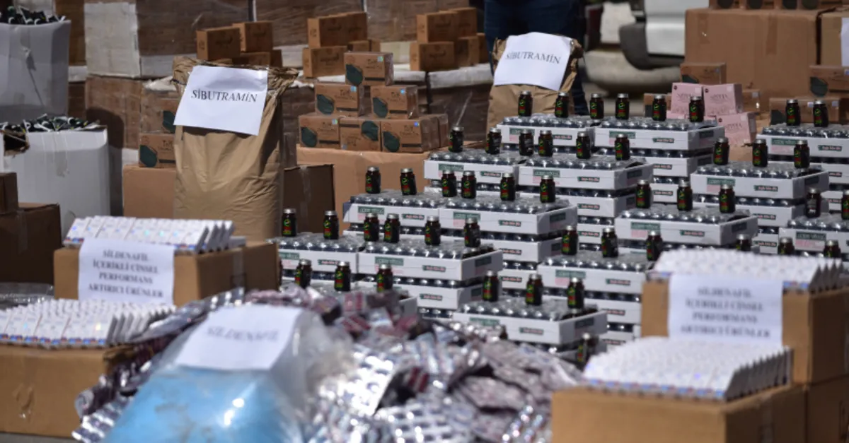 Kaçakçılık Suçlarıyla Mücadele Şube Müdürlüğü ve Gümrükler Muhafaza Genel Müdürlüğü ekipleri yaptığı baskınlarda, toplam 686 kilo 455 gram teff tohumlu zayıflama çayı, 1 milyon 776 bin 245 poşet zayıflama çayı, 2 milyon 130 bin 695 zayıflama kapsülü, 1 ton 300 kilogram Sibutramin hammaddesi, 138 bin 866 kapsül çeşitli hayvanlara ait yem, bin 789 cinsel güç arttırıcı sprey, 228 bin 812 çeşitli markalarda cinsel güç arttırıcı bal, 3 milyon 624 bin 367 cinsel güç arttırıcı macun, 66 bin 261 sıkılaştırıcı krem, 3 bin 545 zayıflama jeli, 55 bin 400 cinsel güç arttırıcı jel, 380 paket cinsel güç arttırıcı kahve, 141 bin 440 paket cinsel güç arttırıcı çikolata, 7 kilo 670 gram çikolata ve çay yapımında kullanılan hammadde, toz halinde 200 paket bağırsak çalıştırıcı, 31 sıvı dolum, kapsül, basım, filtre ve ambalaj makineleri, 13 varil ve ruhsatsız 1 tabanca ele geçirildi.