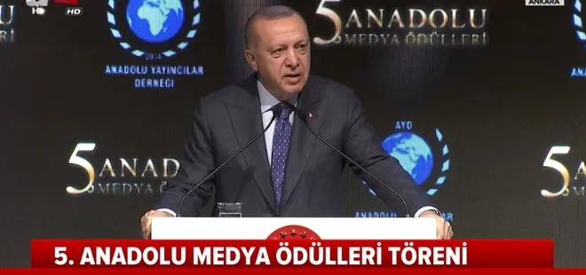 Cumhurbaşkanı Erdoğan, Anadolu Yayıncılar Derneğince (AYD) JW Marriott Otel'de bu yıl 5'incisi düzenlenen Anadolu Medya Ödülleri törenindeki konuşmasına derneğin yönetimine teşekkür ederek başladı.